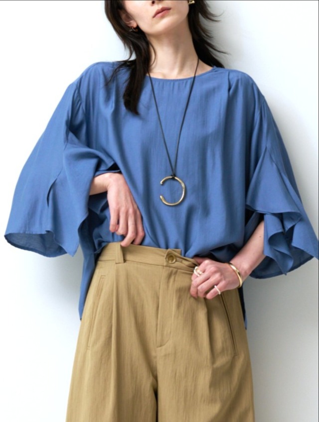 【CHIGNON】シニヨン 華やかな袖のフリルデザインがポイントのブラウス。 落ち感のあるなめらかな風合いが魅力で、さらりとした肌触りで今すぐ着られる一枚です。程よい光沢があり、カジュアルになりすぎずきれいめなスタイリングにもマッチします。 動くたびに揺れるフリルが女性らしさを引き立て、スリットを入れることで抜け感のある軽やかな印象に仕上げました。甘くなりすぎないよう、パターンにこだわった立体的なディテールがポイントです。 身頃はすっきりとしたシルエットで、パンツにもスカートにも合わせやすいバランス。1枚で着映えするのはもちろん、秋口にはベストやジレのインナーとしても活躍します。 オンにもオフにも使える、着回し力の高いブラウスです。 着丈:60cm 身幅(半身):57.5cm 肩幅:43cm 袖丈:36cm 【取り扱い方法】 手洗い 【素材】 レーヨン:90% / ポリエステル:10%【原産国】 CHINA 【納期】 5/下旬~6/上旬