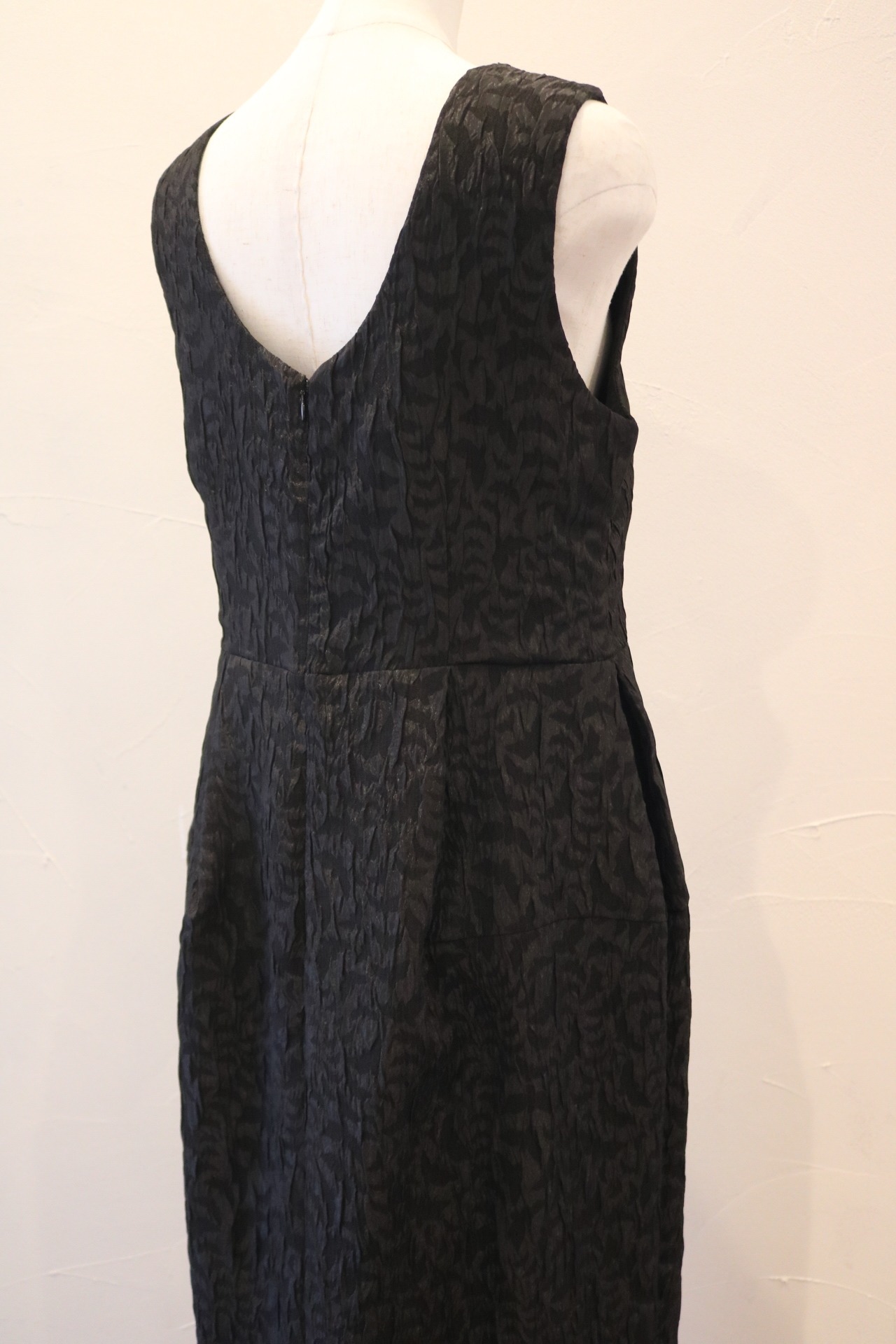 更にヒップから裾にかけて細くなるシルエットで、全体的にスタイルアップしてみえるワンピースです。