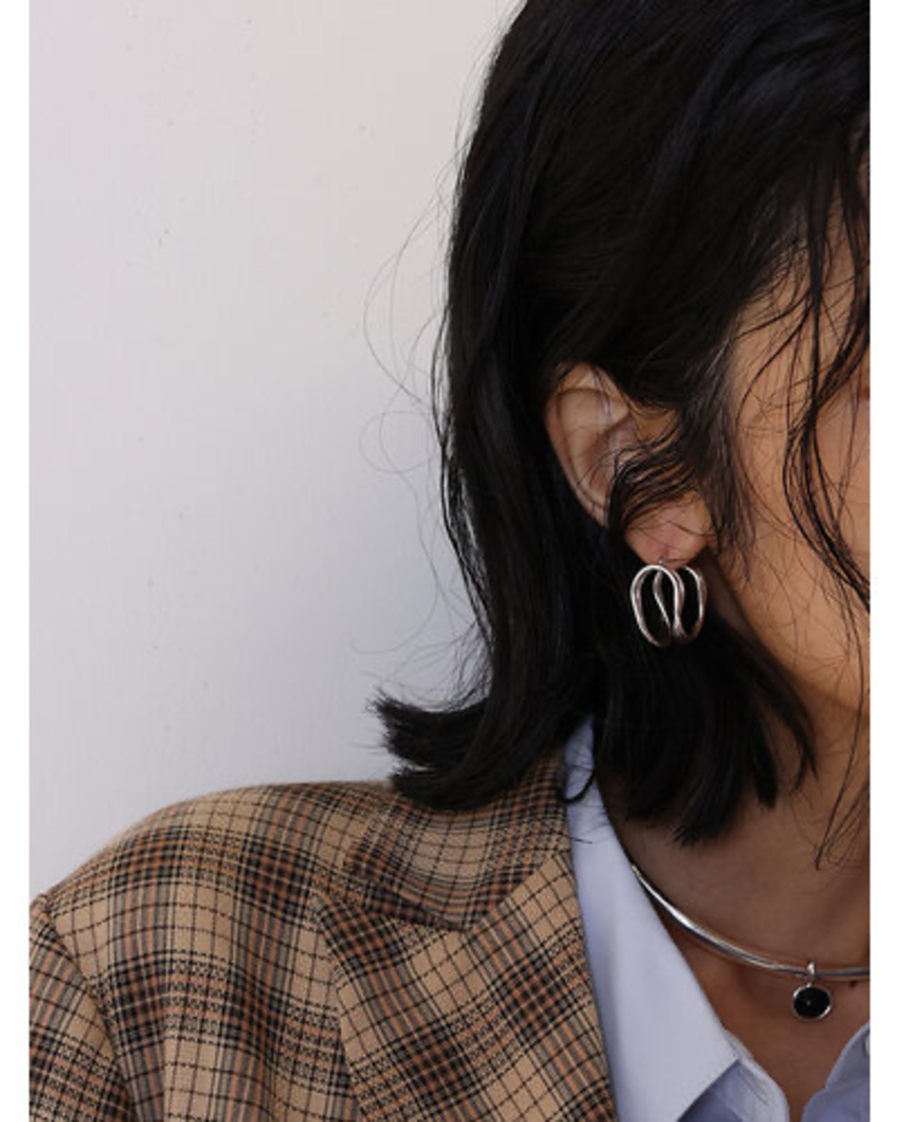 華奢な3本線で描かれたカーブラインピアスは軽やかさを感じさせる抜け感と360度どこから見ても立体感のあるデザインになっております。カチッと留めるワンタッチタイプのピアスなのでキャッチを無くす心配もなくストレスフリーに着用が可能です。ピアスポストはヴィンテージ風の山型にカーブしたポストを採用しているので高見え効果も◎丁度いいサイズ感とシンプルなデザインで幅広いジャンルのコーデにマッチする上品なピアスとなっております。
