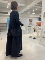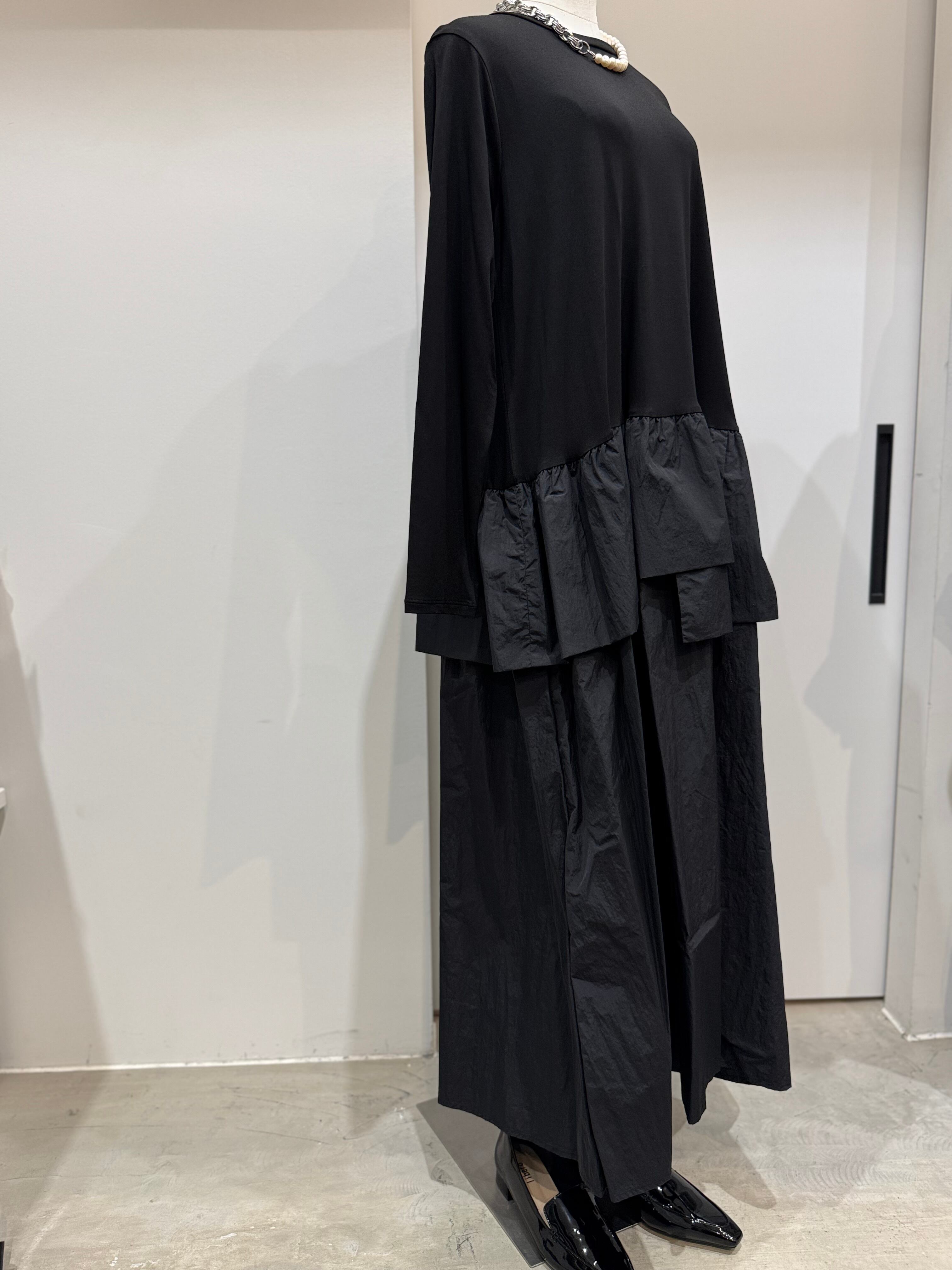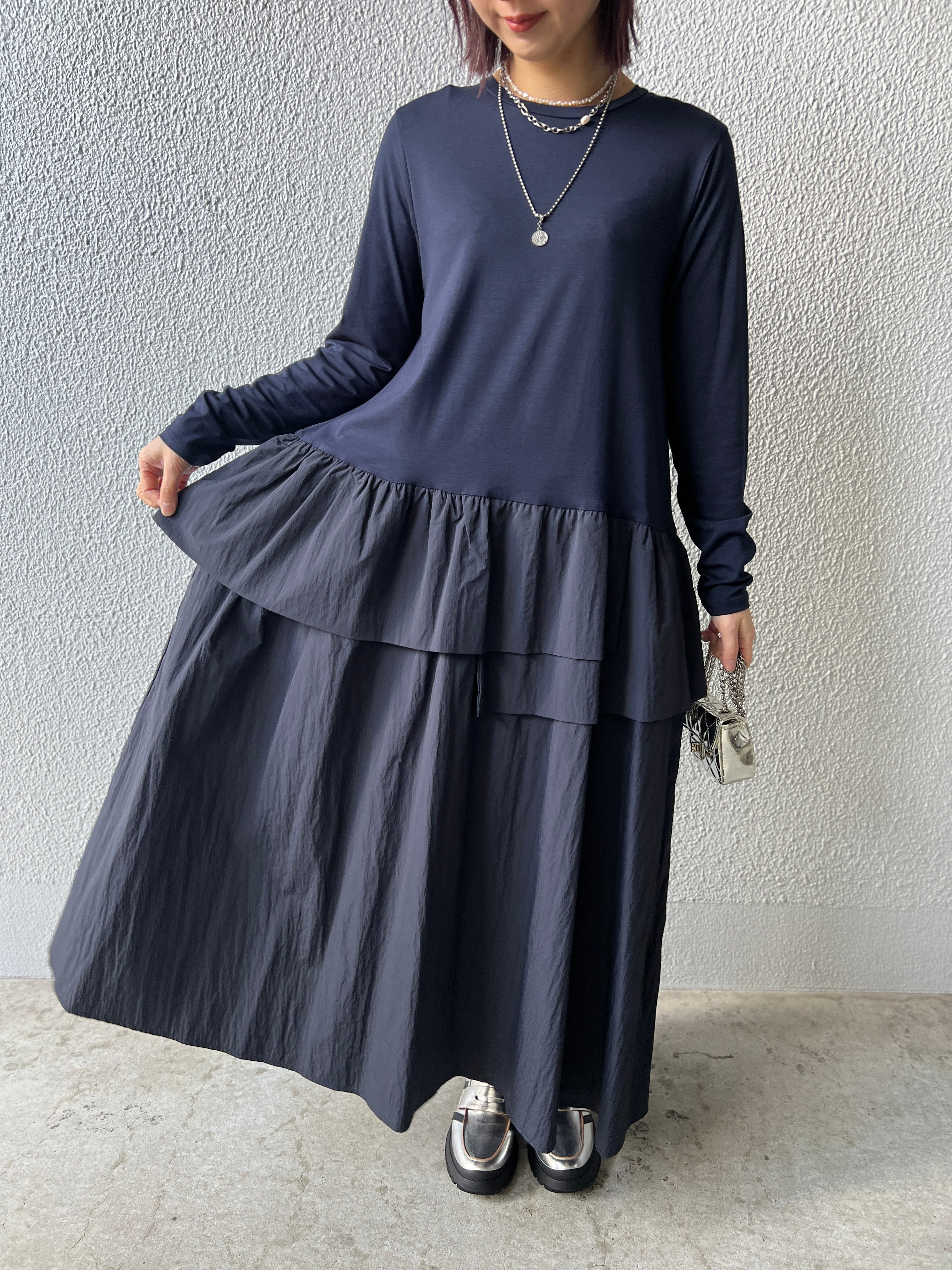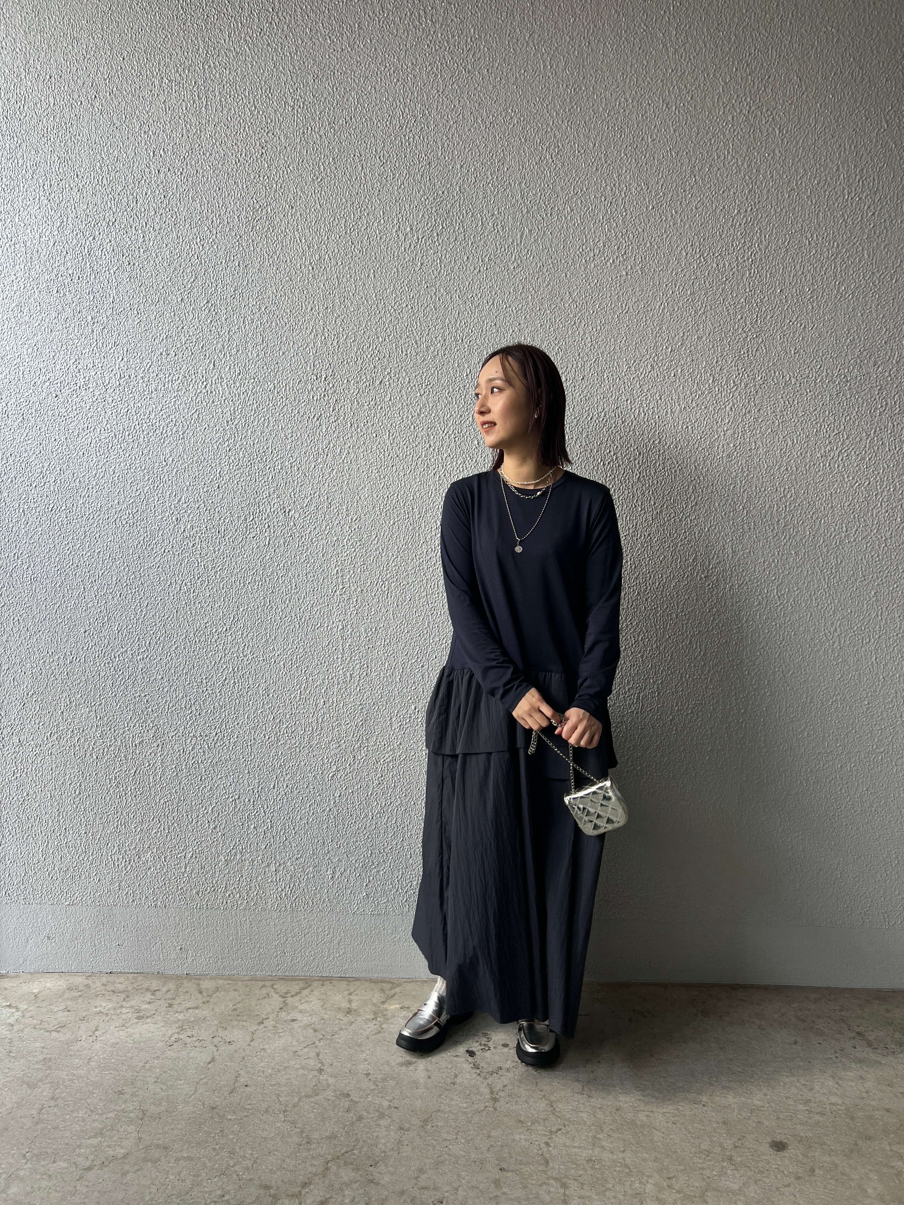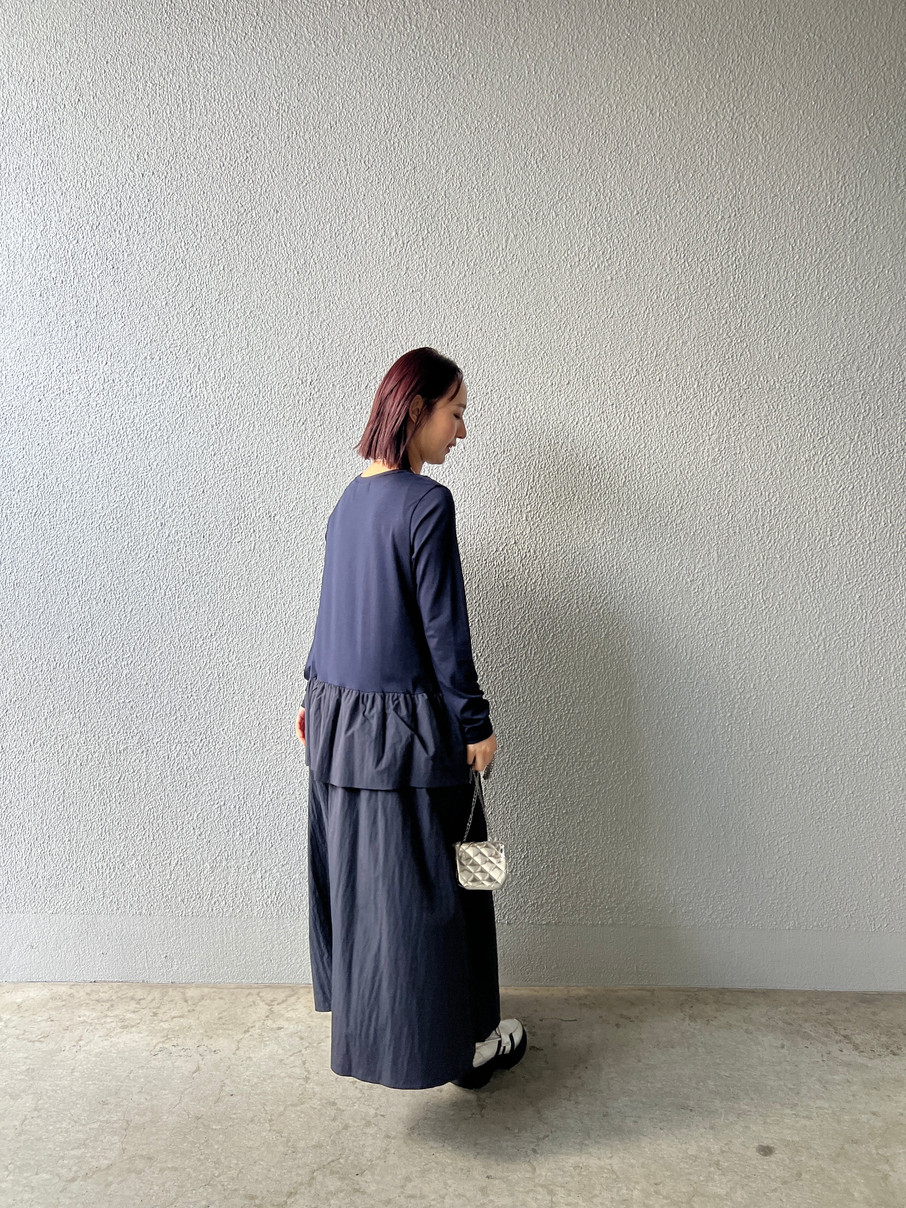 トップス部分は肌触りのよいカットソー素材でリラックス感を、スカート部分にはしなやかでハリのあるタフタ素材を合わせ、甘さを抑えたモードな印象に仕上げました。