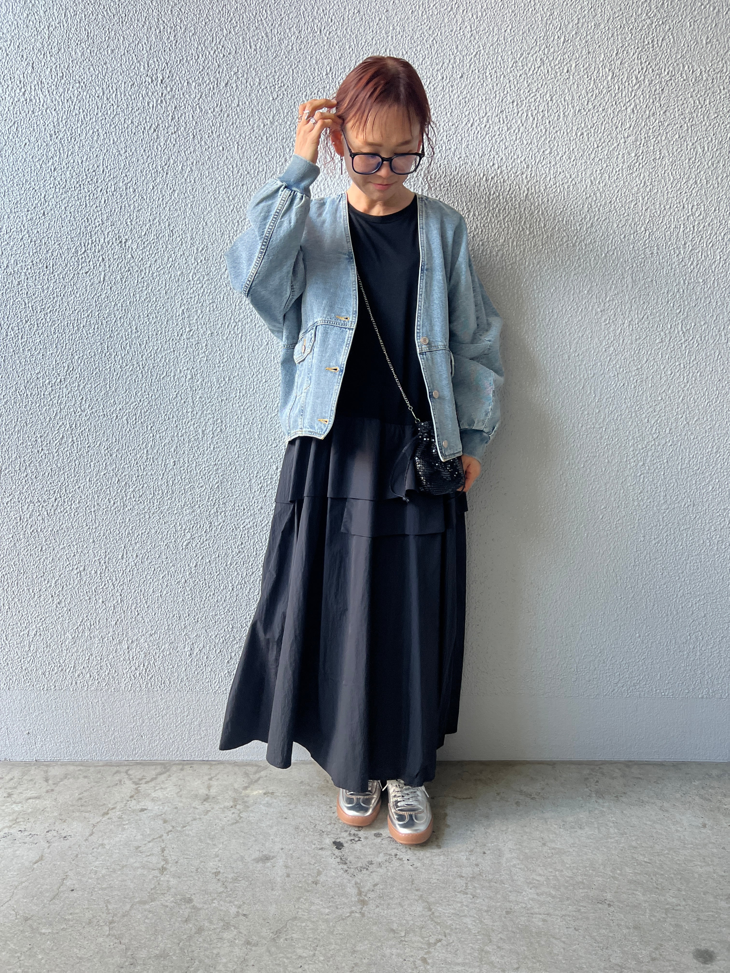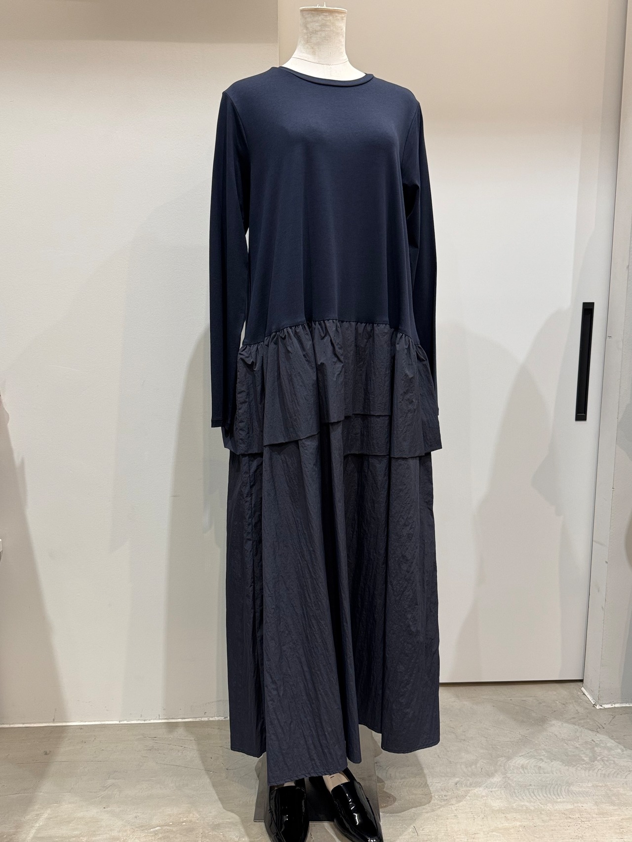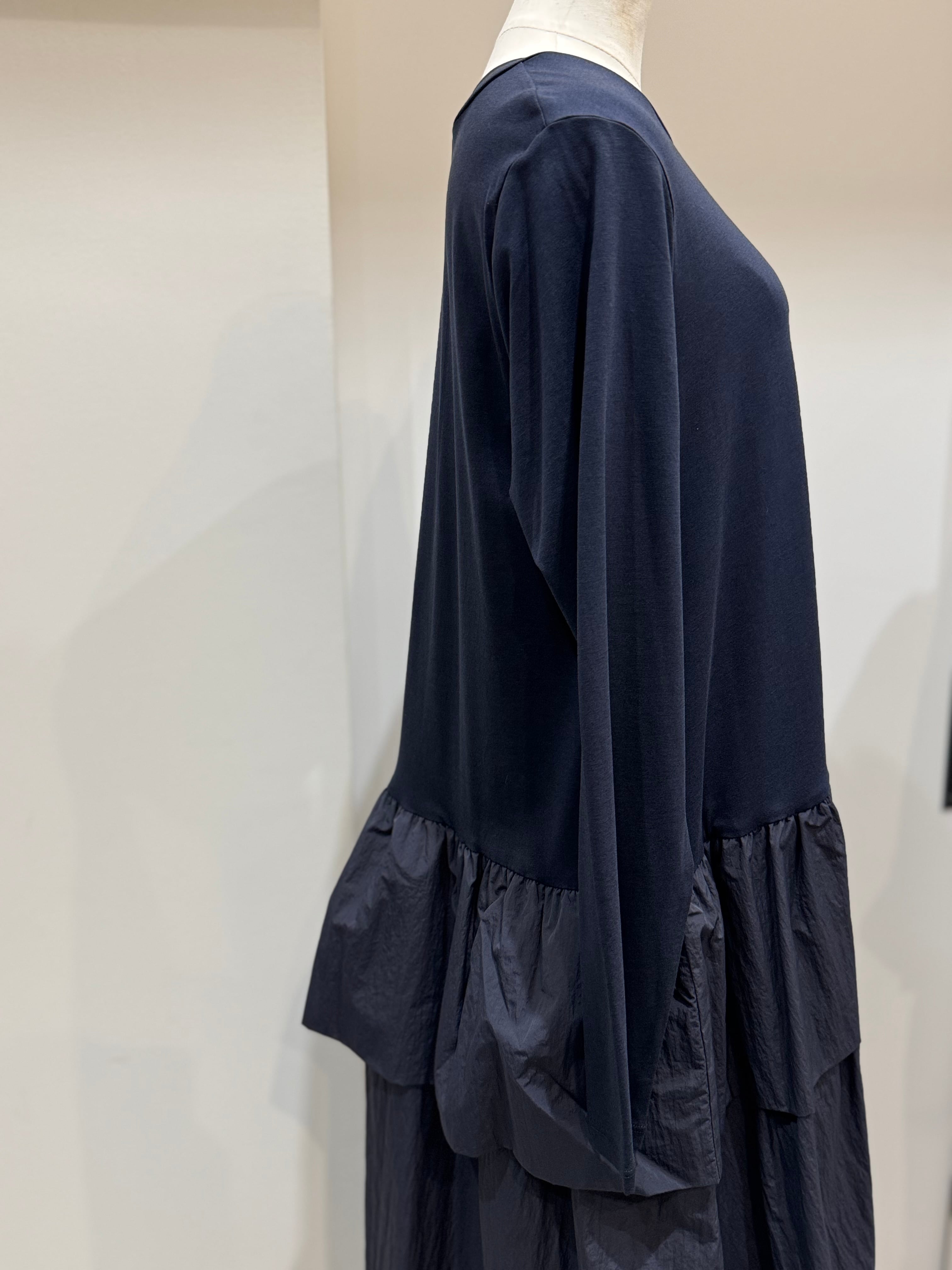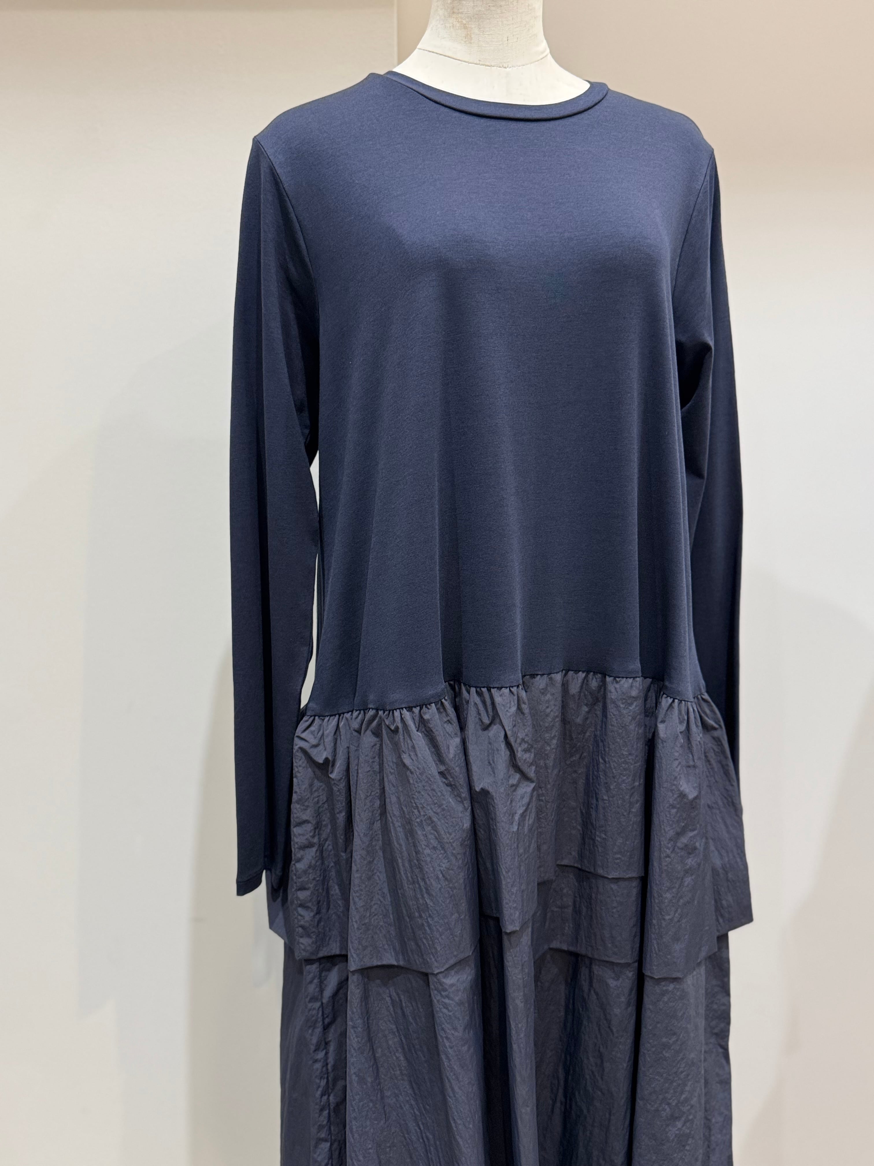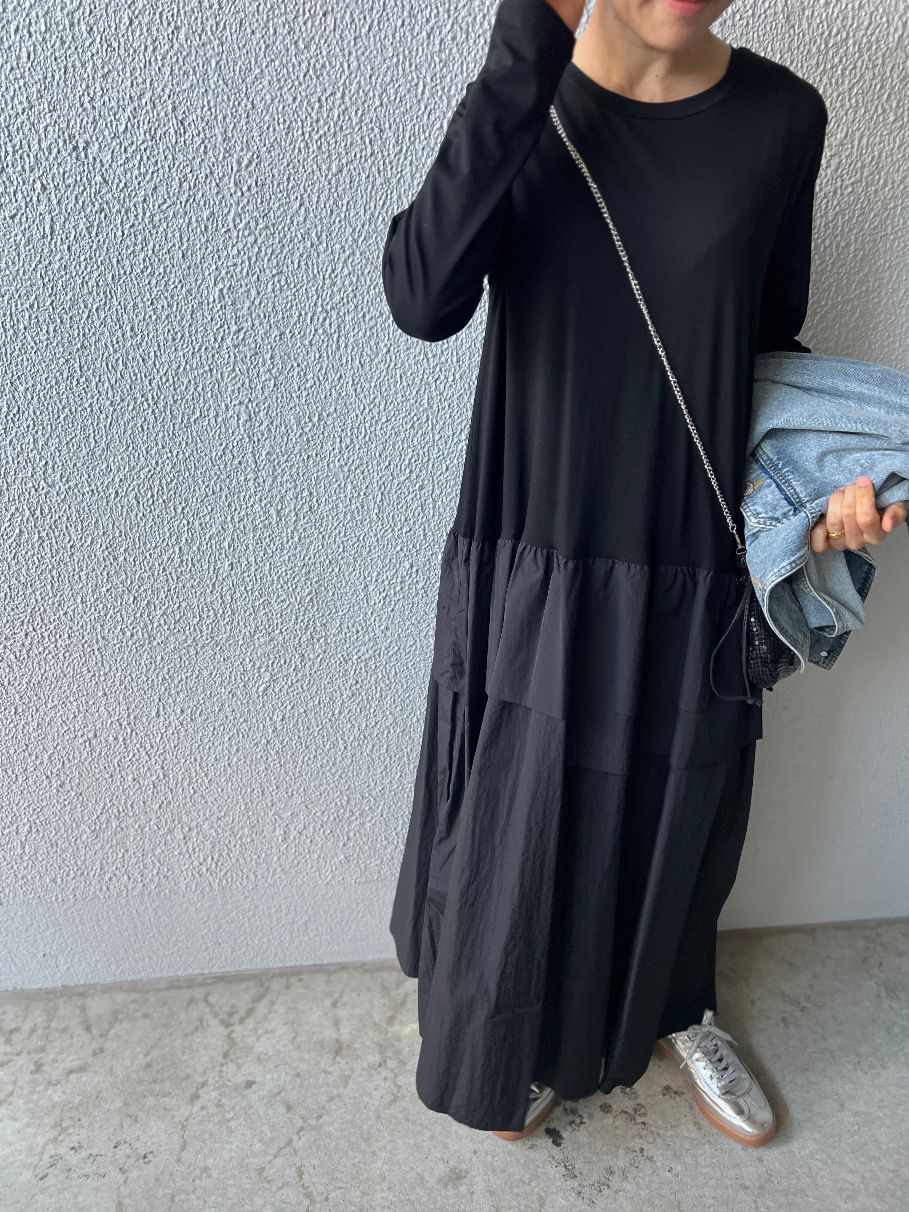 トップス部分は肌触りのよいカットソー素材でリラックス感を、スカート部分にはしなやかでハリのあるタフタ素材を合わせ、甘さを抑えたモードな印象に仕上げました。