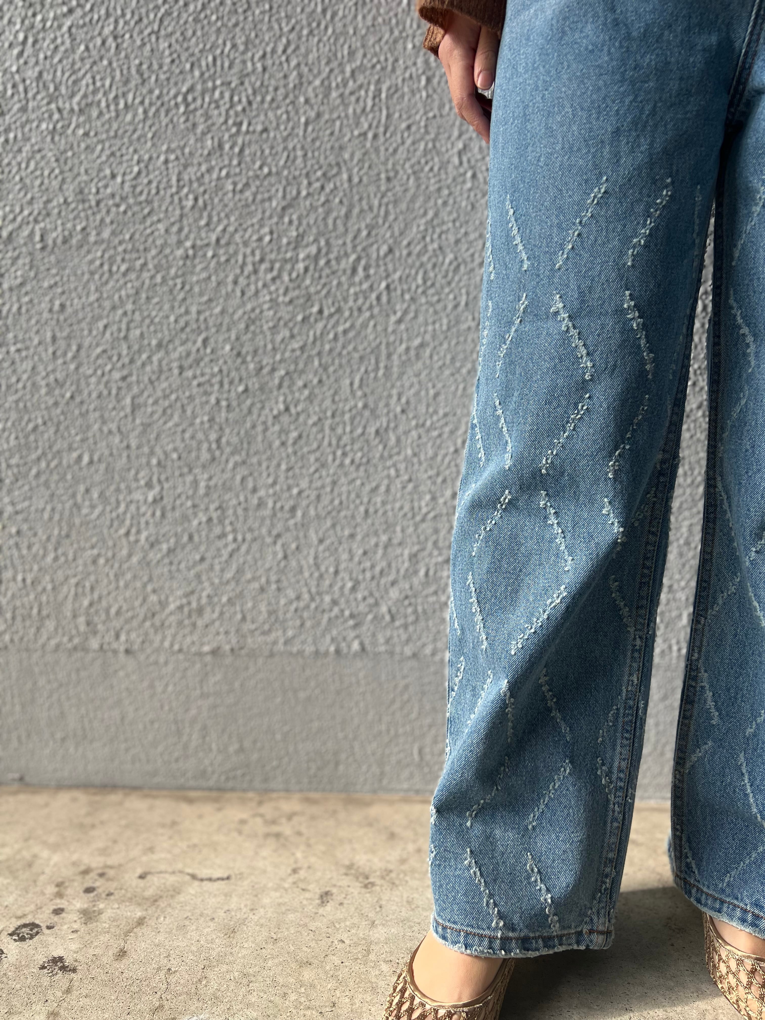 手作業のクラッシュやブリーチでは出せない、レーザーならではのシャープでコントロールされたダメージで表現する柄は、モロッカンタイルをモチーフにしたジオメトリック柄を採用。アート感覚のデニムに仕上げました。