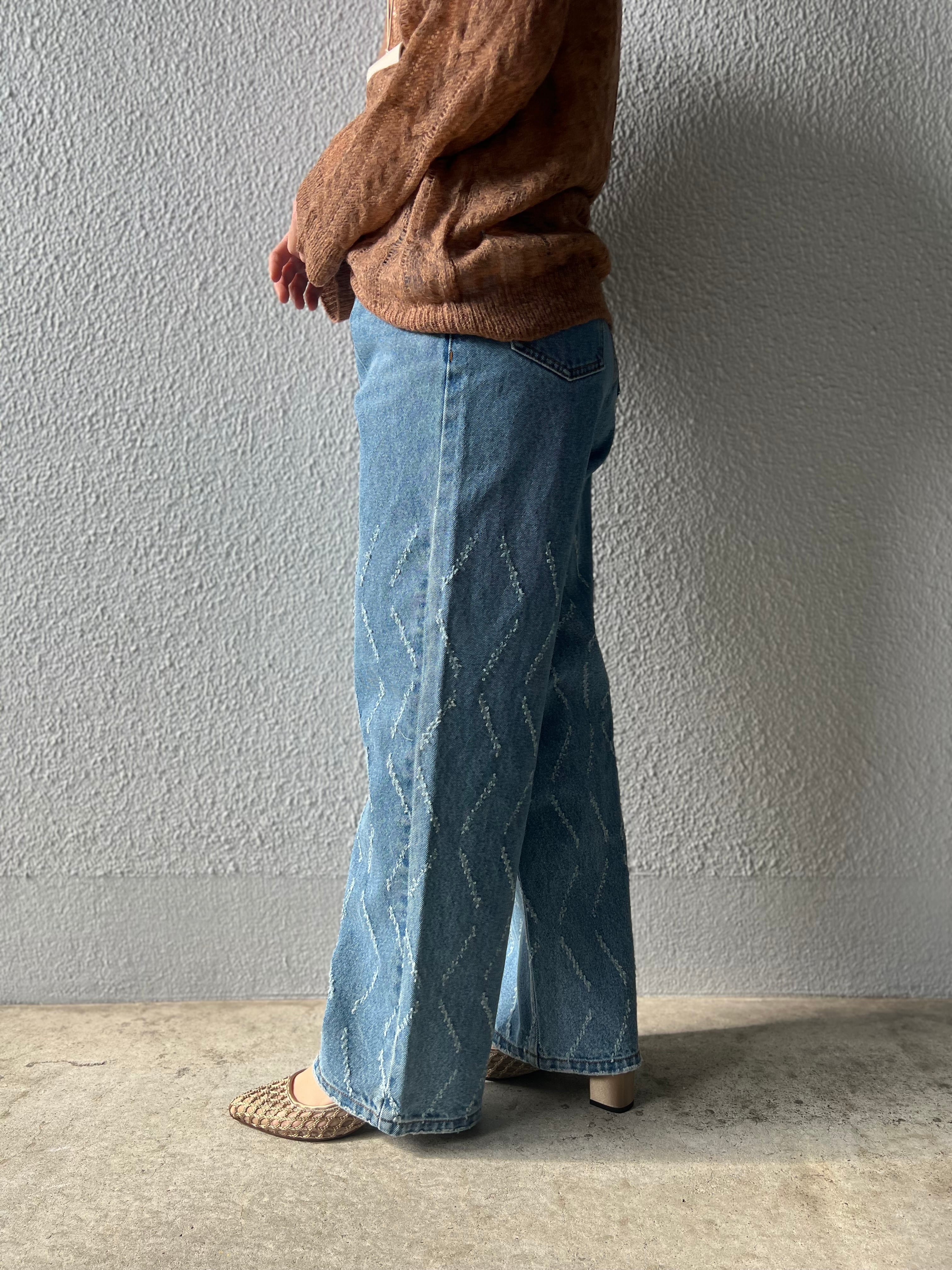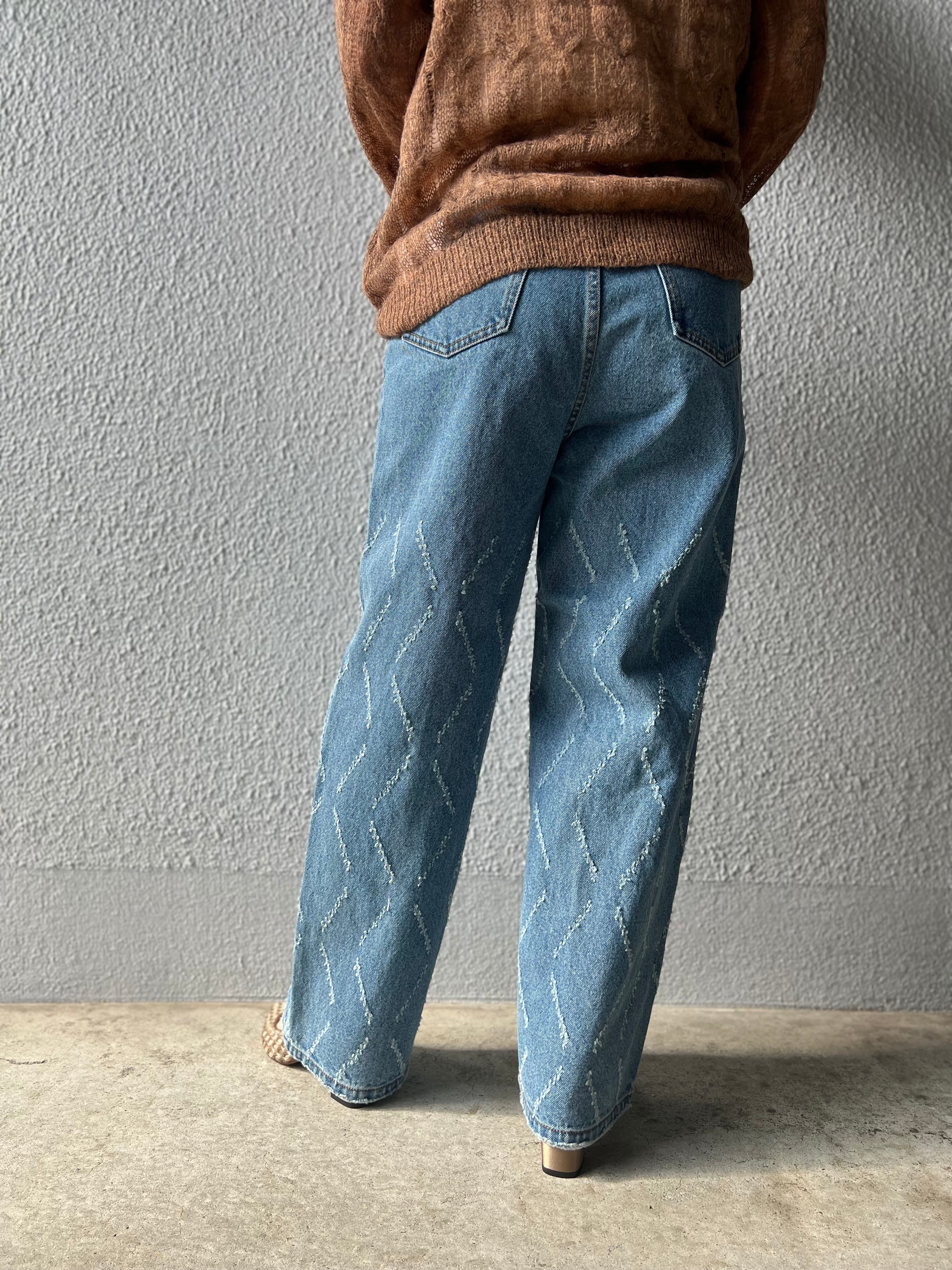 レーザー加工で表現するオリジナルパターンが特徴のデニムパンツです。