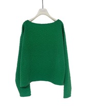 衿はボートネックで、下着が見えにくいネックサイズになっております。ゆったりとしたボックスシルエットですが、着丈はコンパクトなので、パンツ合わせでもスカート合わせでもコーディネートしやすいです。