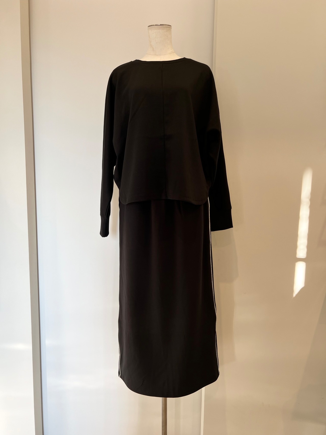 スカートはタイトすぎない程よいゆったり感と、ストレッチ性のあるストレートシルエット。