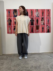 フロントにタックがありゆったりとした設定で、裾口にダーツを入れて少し絞ったコクーンシルエット。