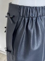 セミマットな質感のフェイクレザーを使用したリボンの甘さとモード感が際立つミニスカート。シンプルなシルエットにほんのりフレアを加えた台形シルエットで、女性らしい動きをプラス。