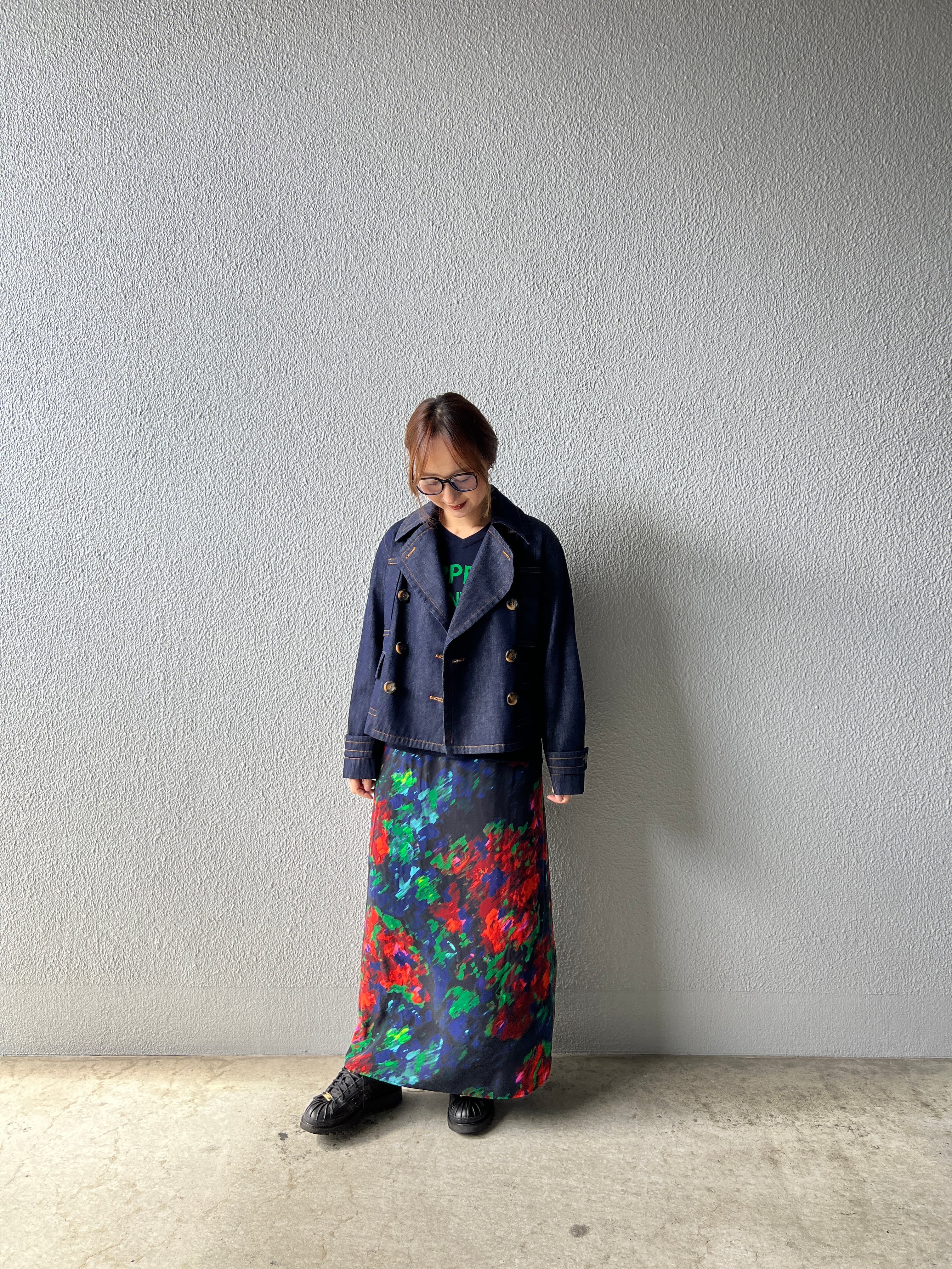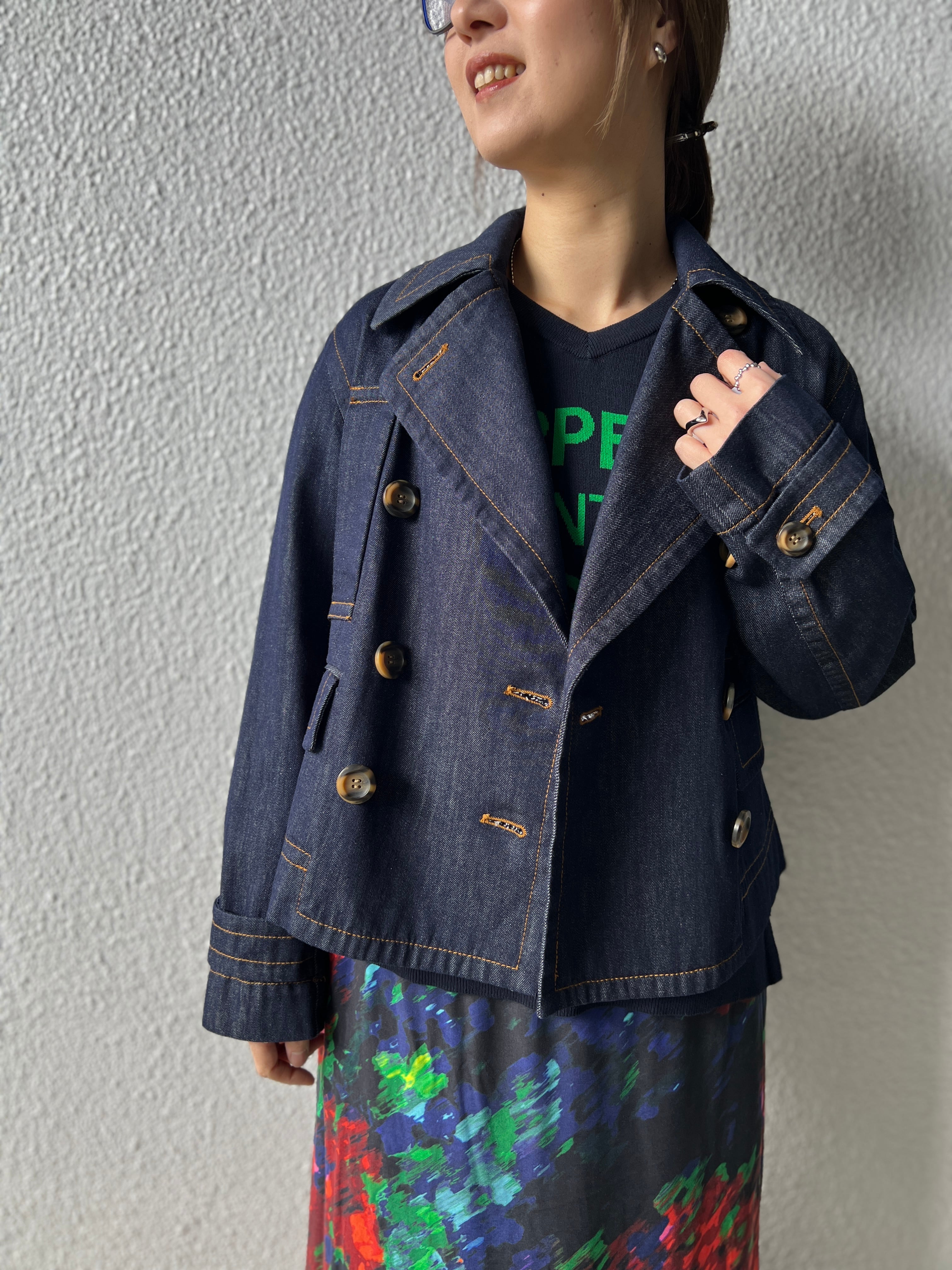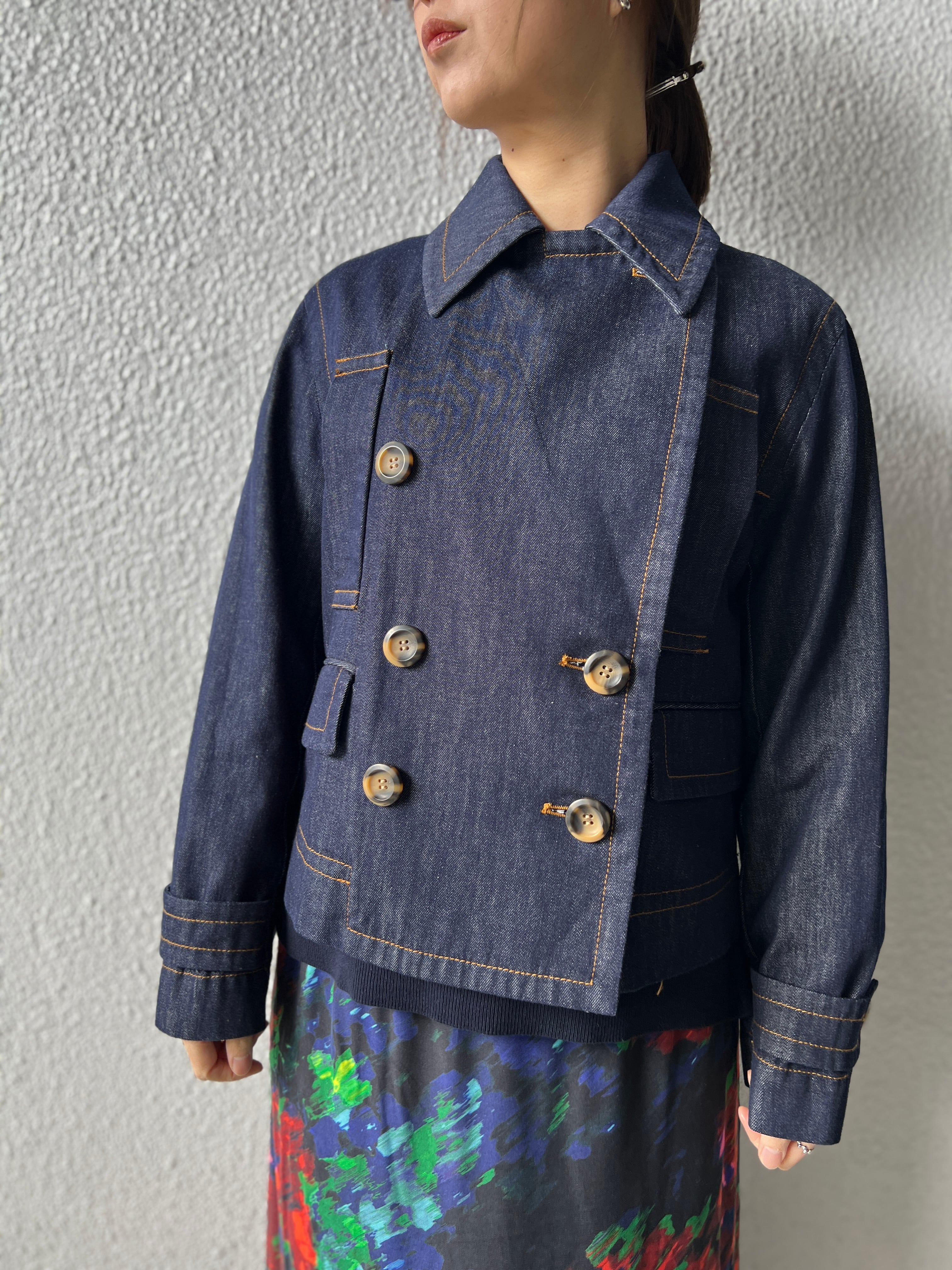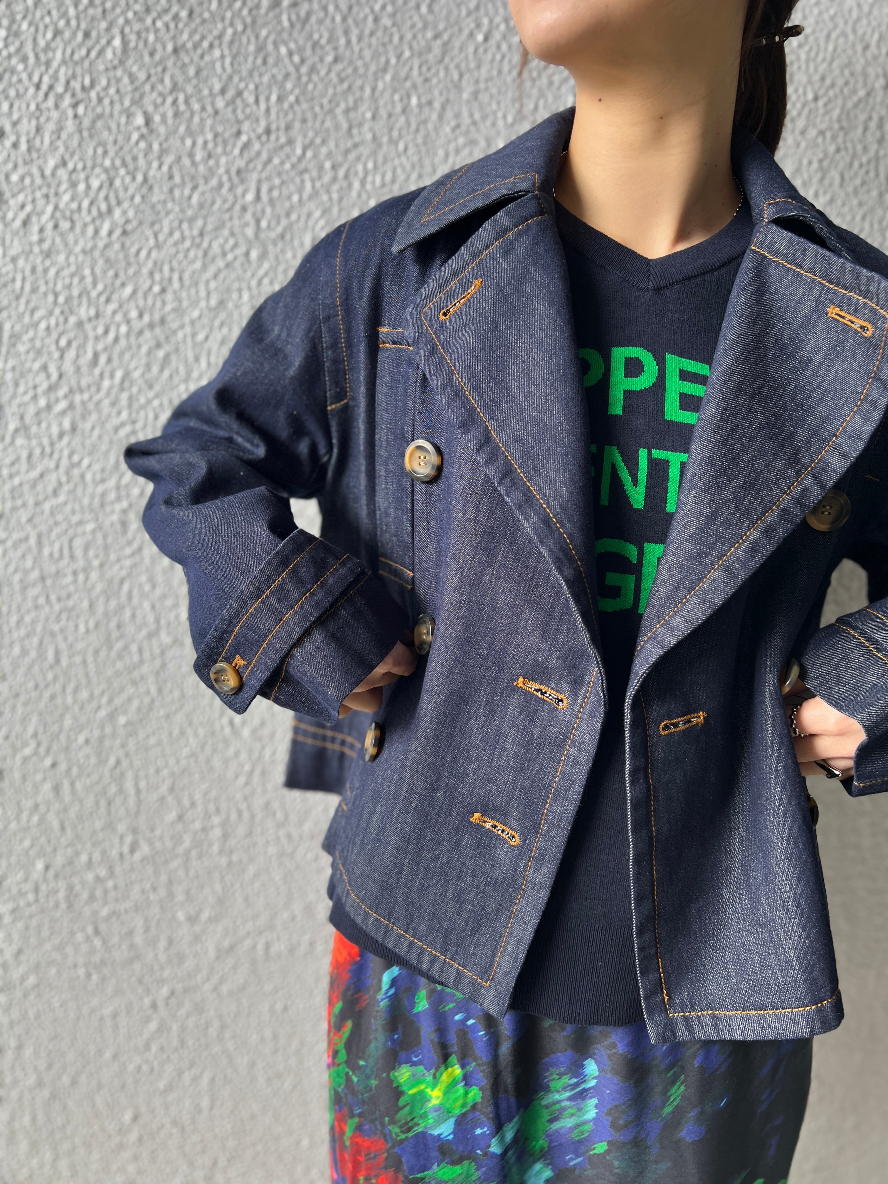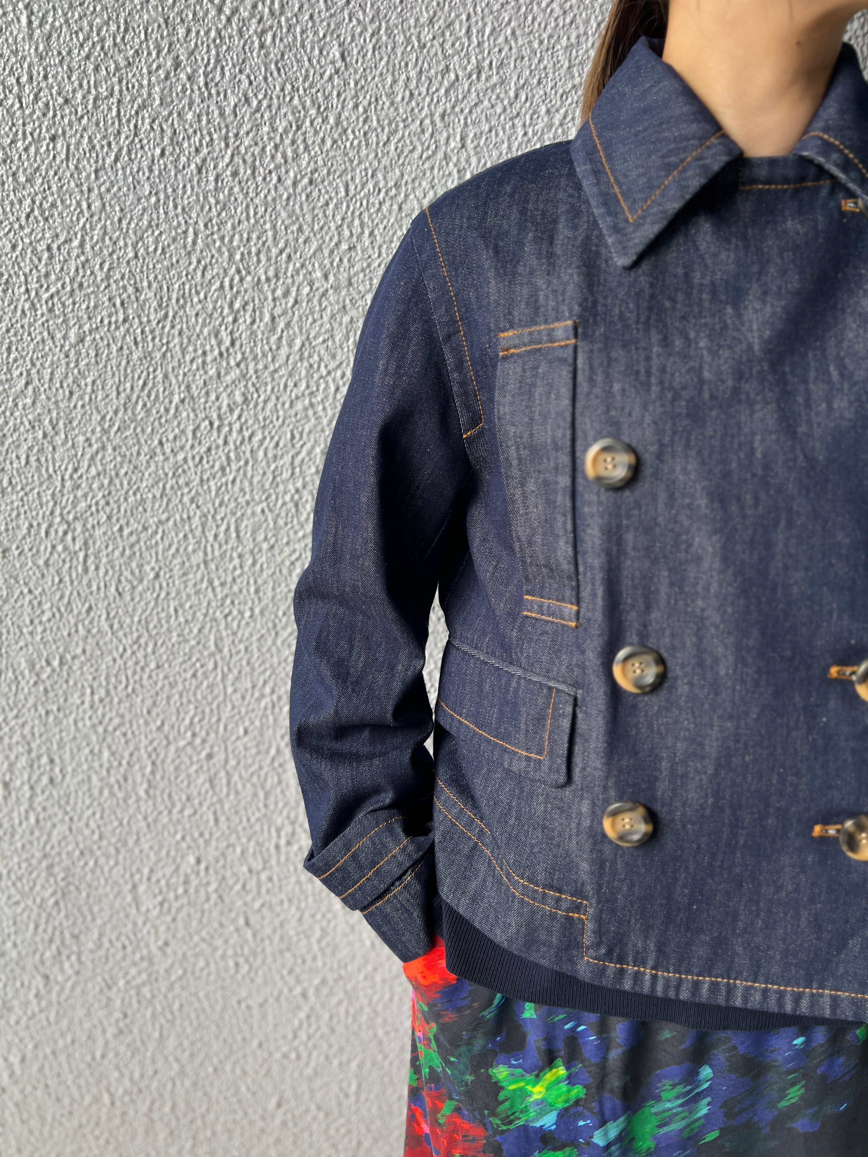 クラシックな印象ながら、デニム素材や、鼈甲ボタンで程よくカジュアルダウン