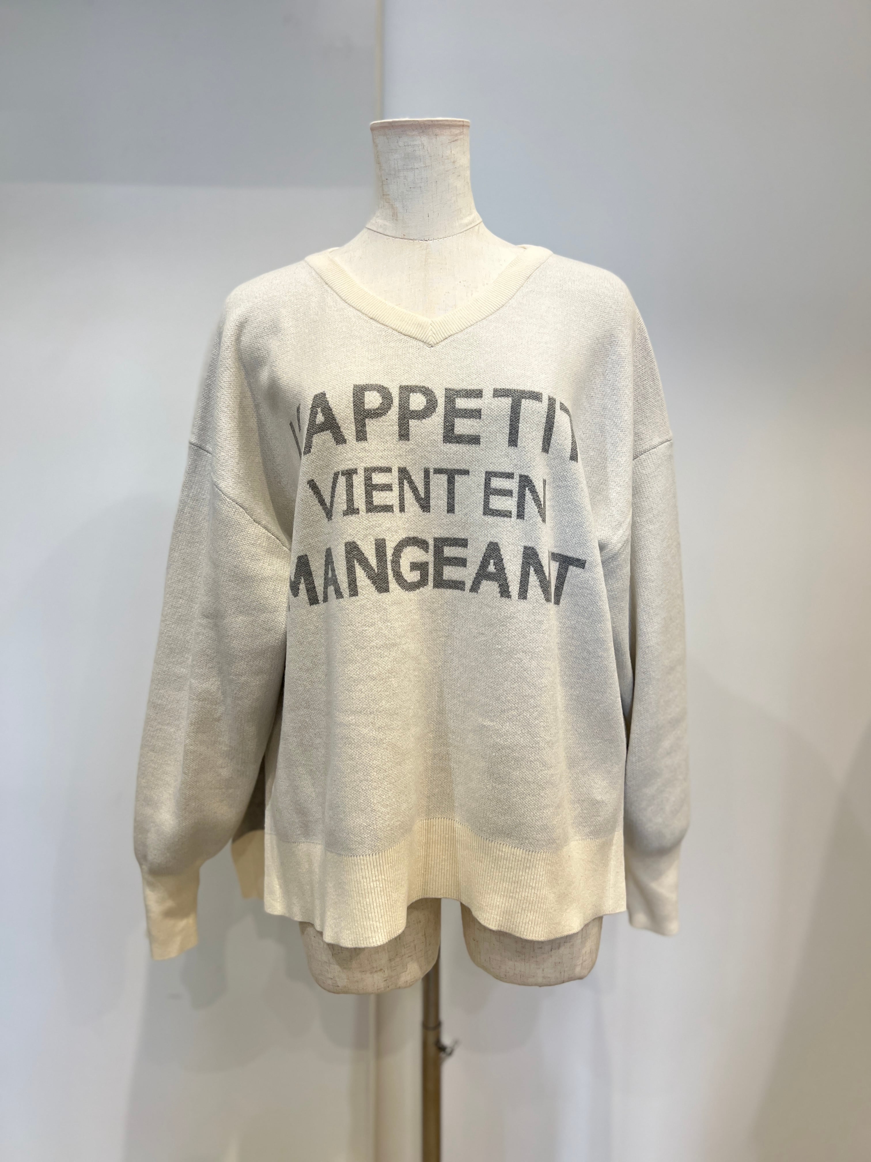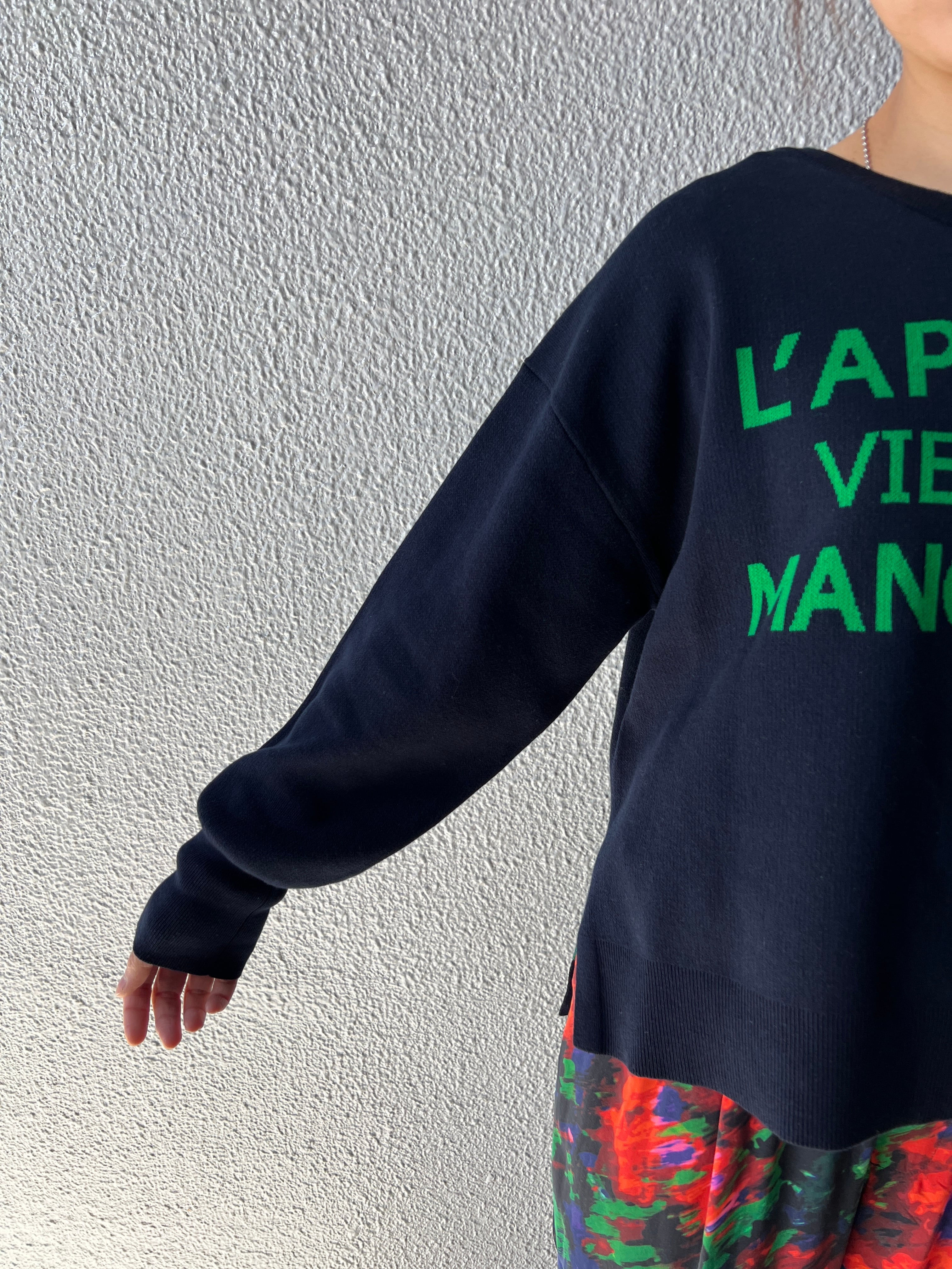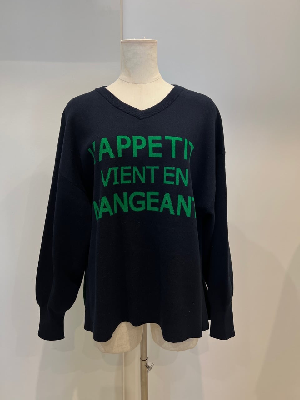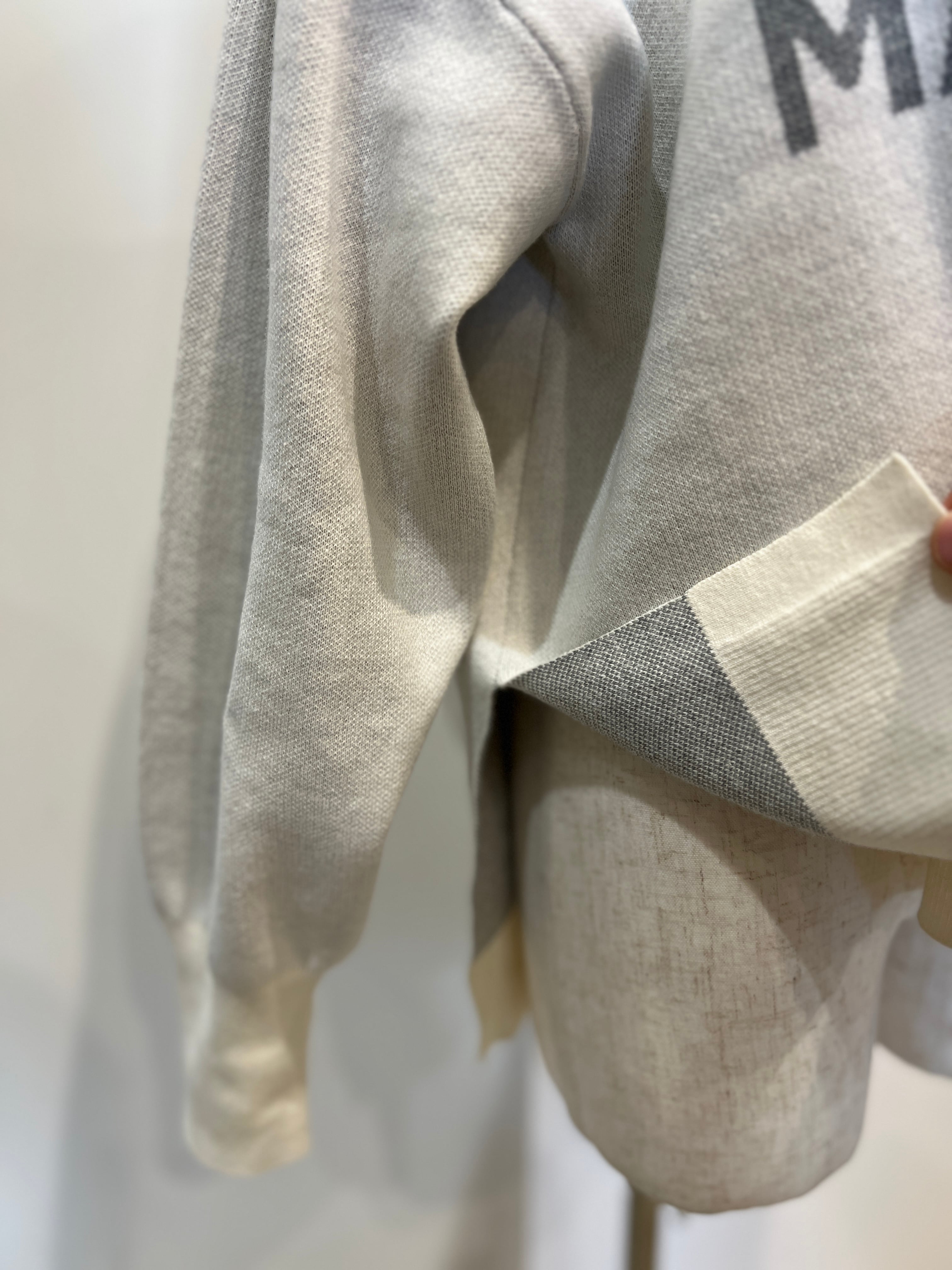 配色のロゴがあっても、カジュアルすぎないところがポイントなスウェット見えするニットです。