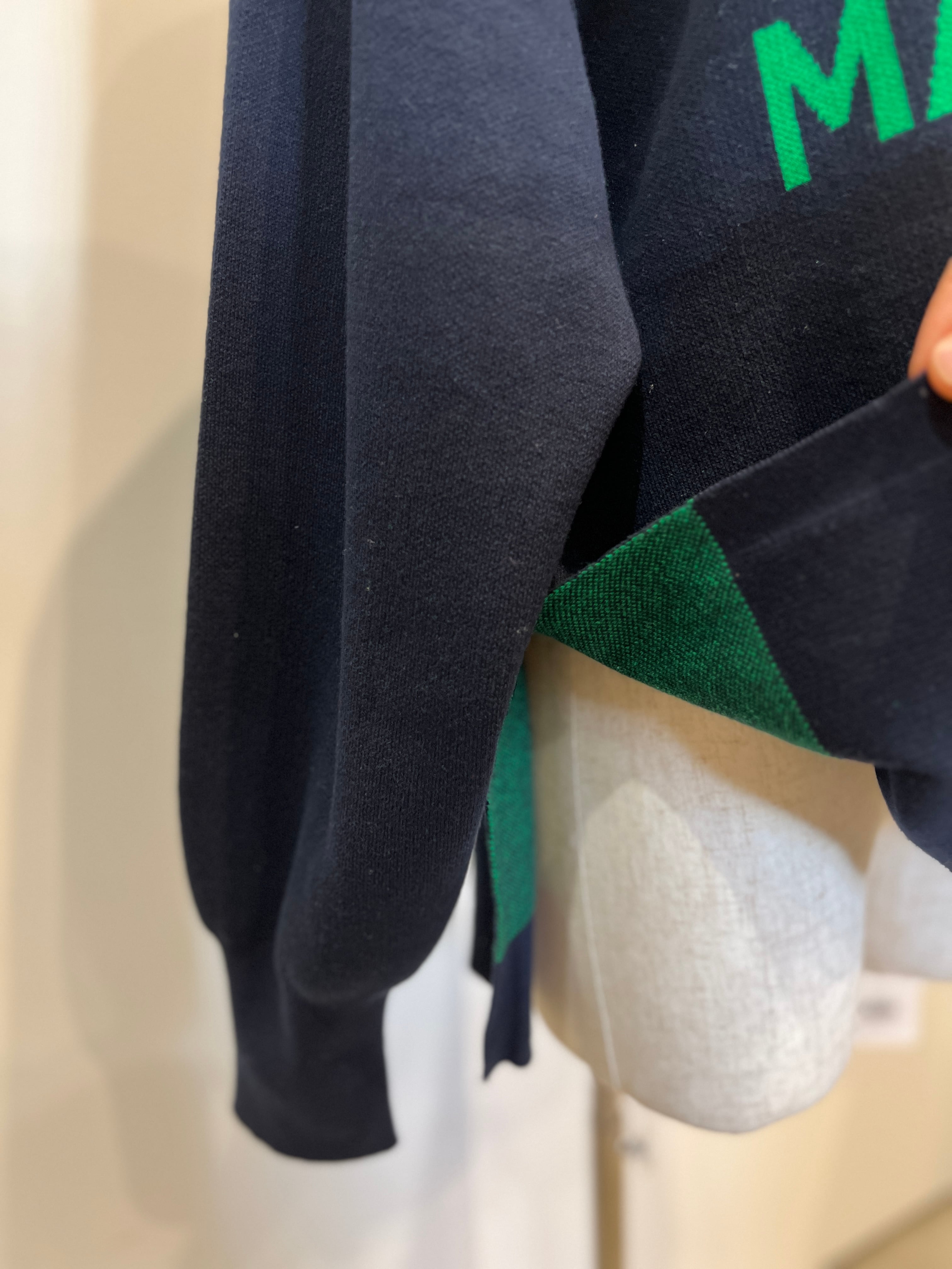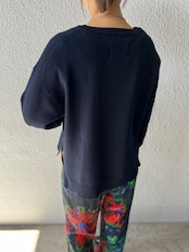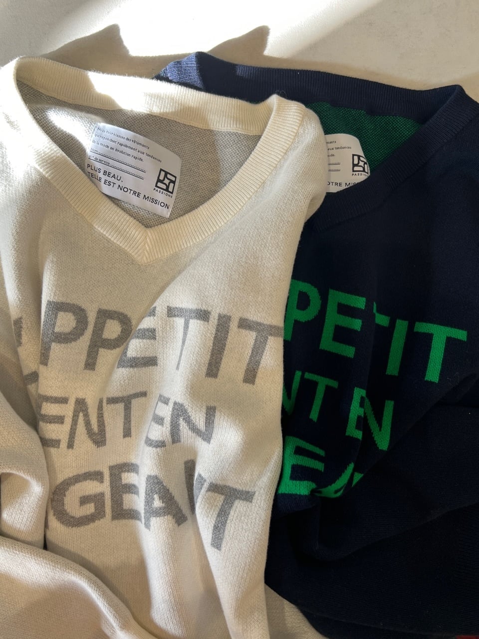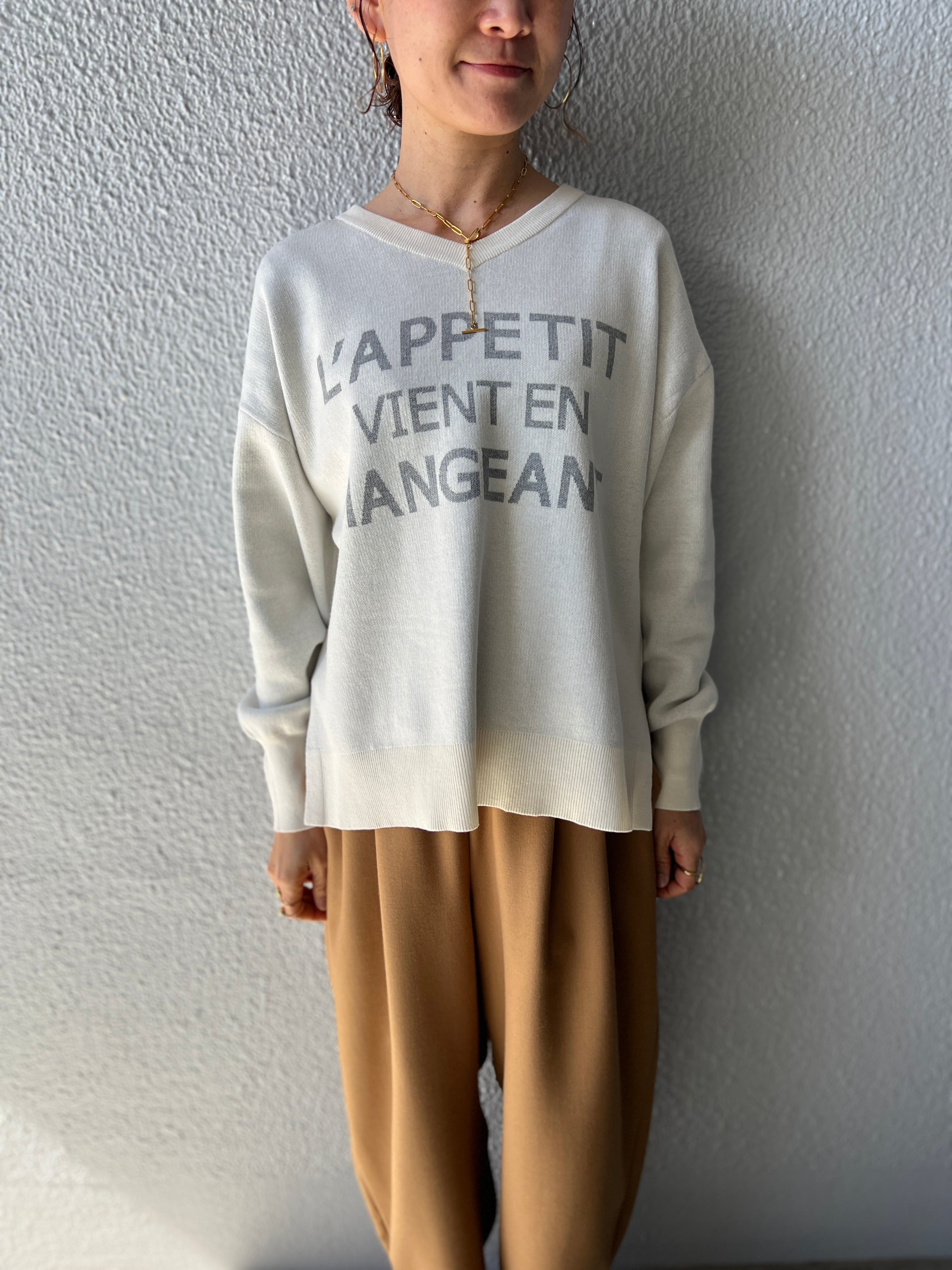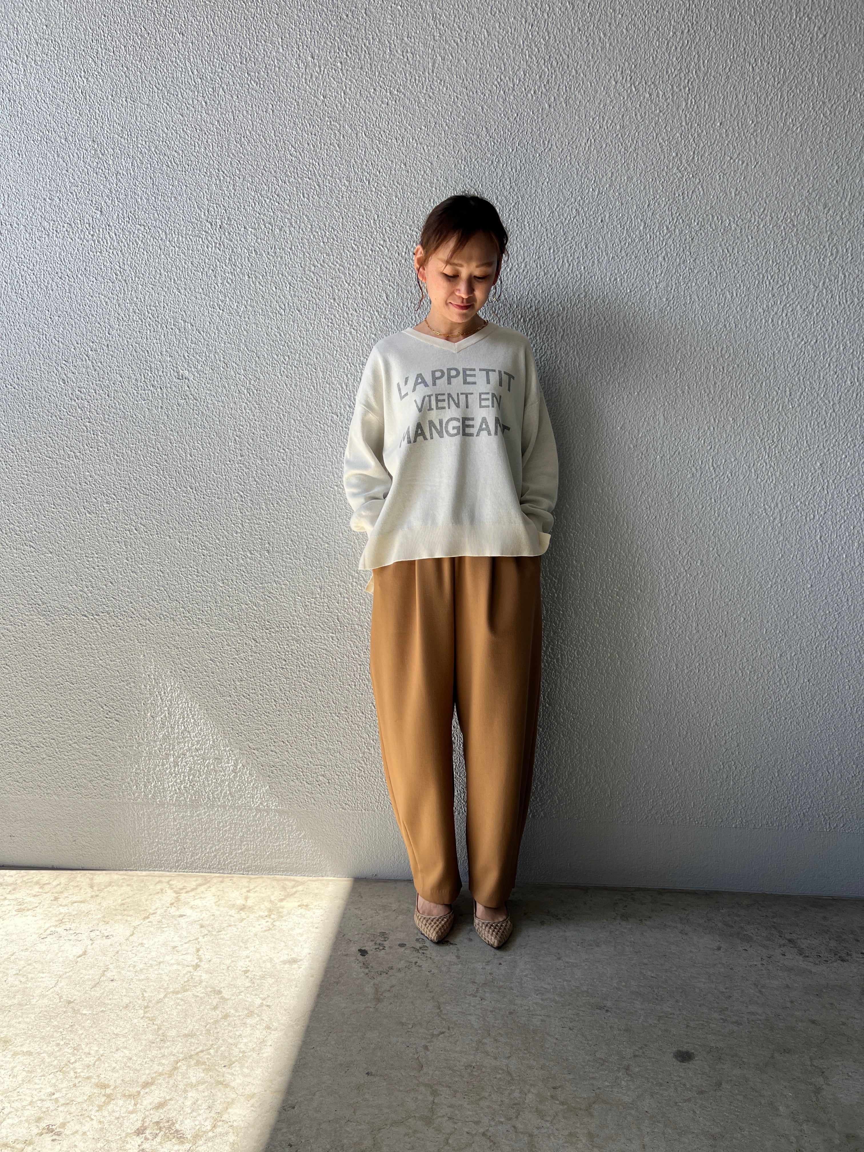 配色のロゴがあっても、カジュアルすぎないところがポイントなスウェット見えするニットです。