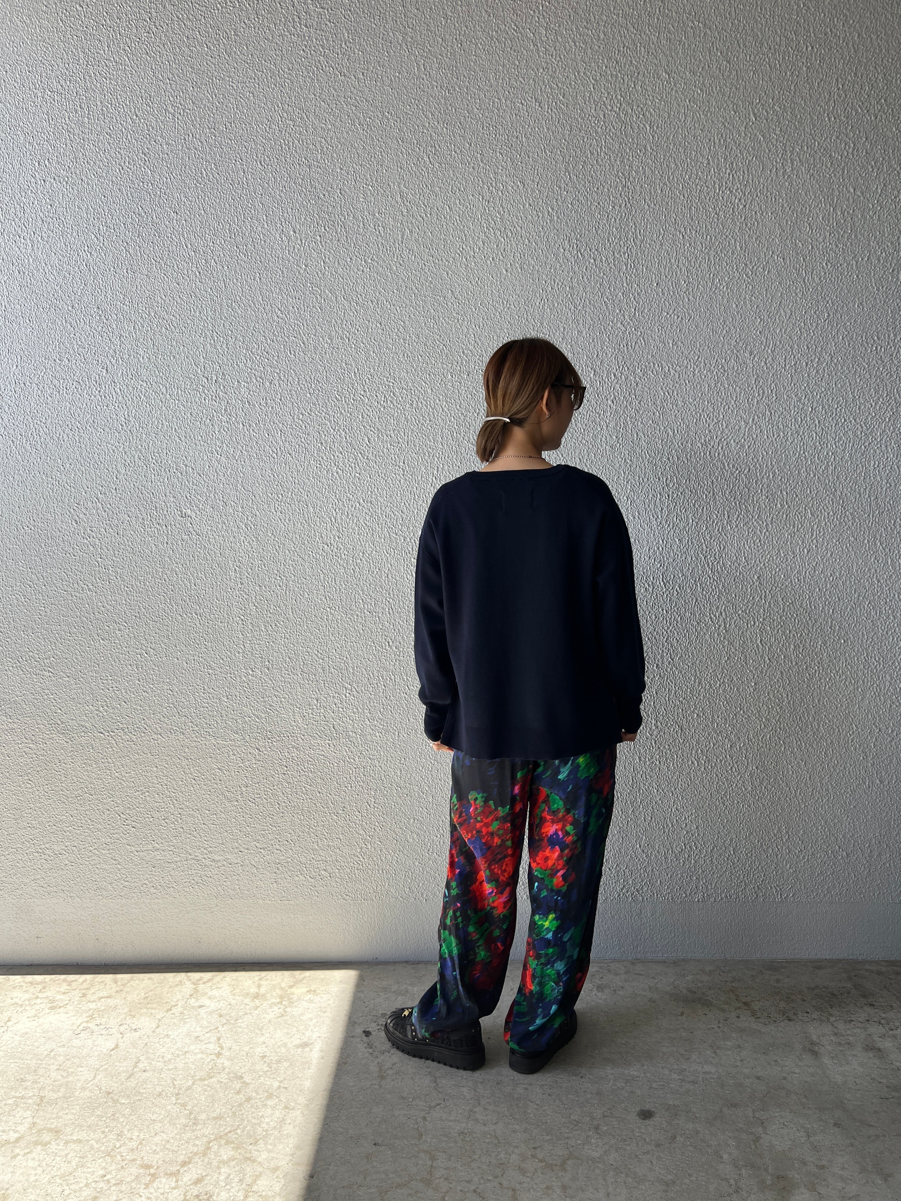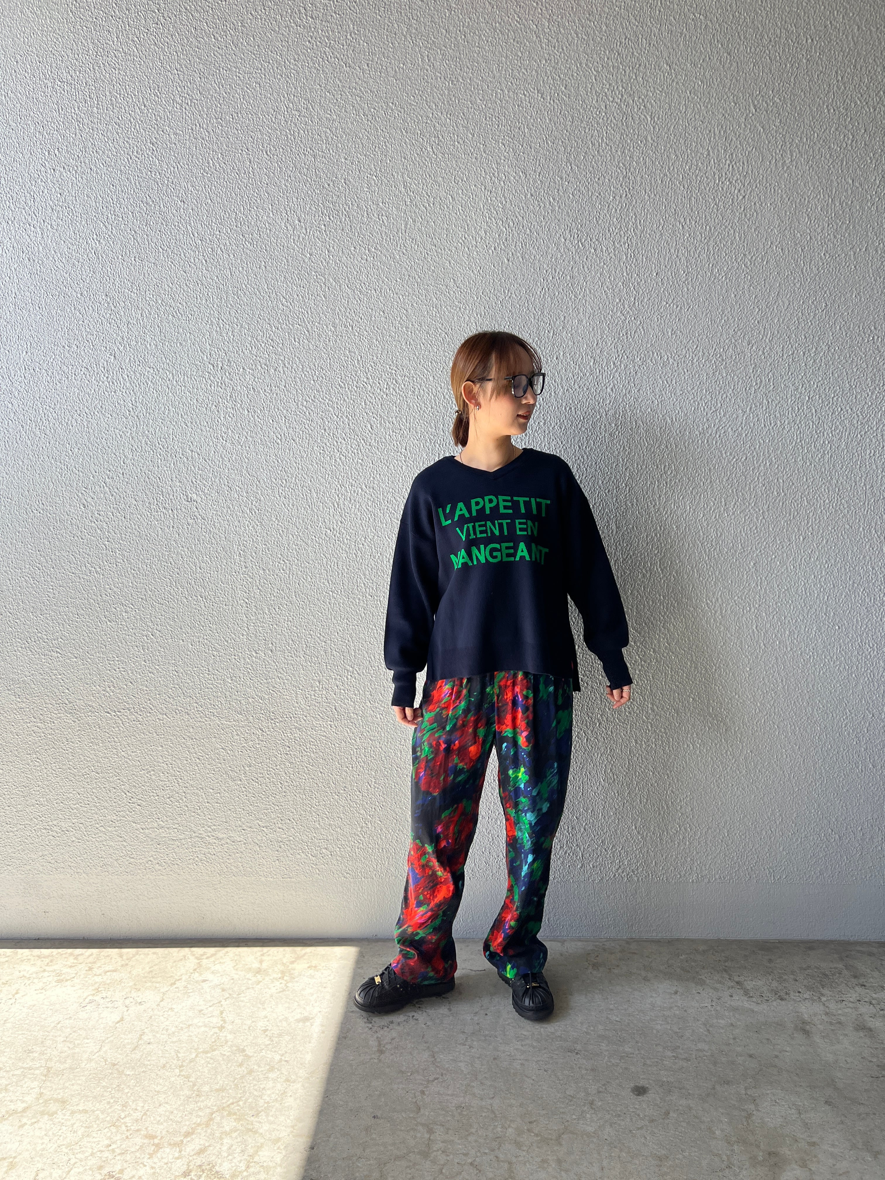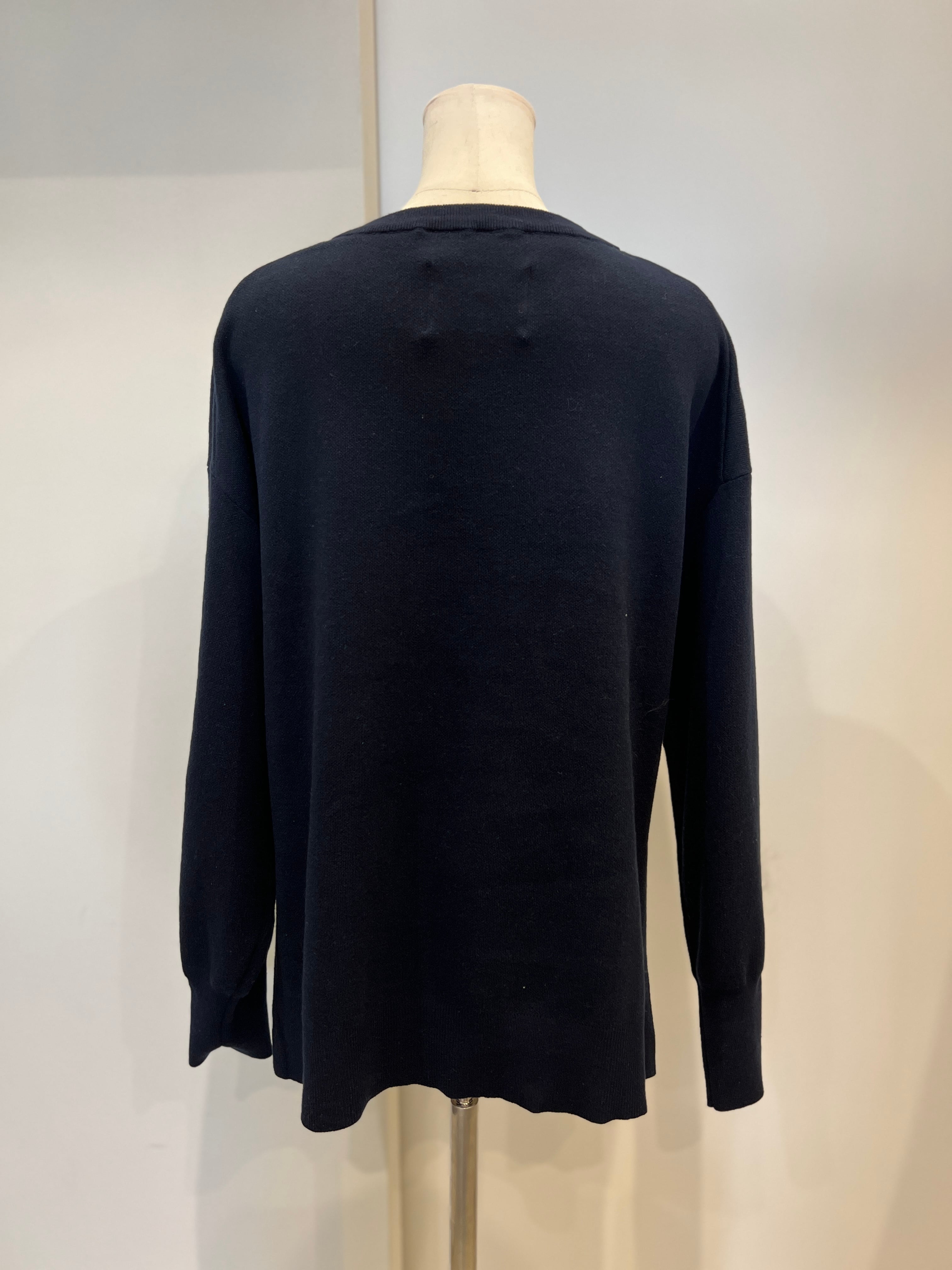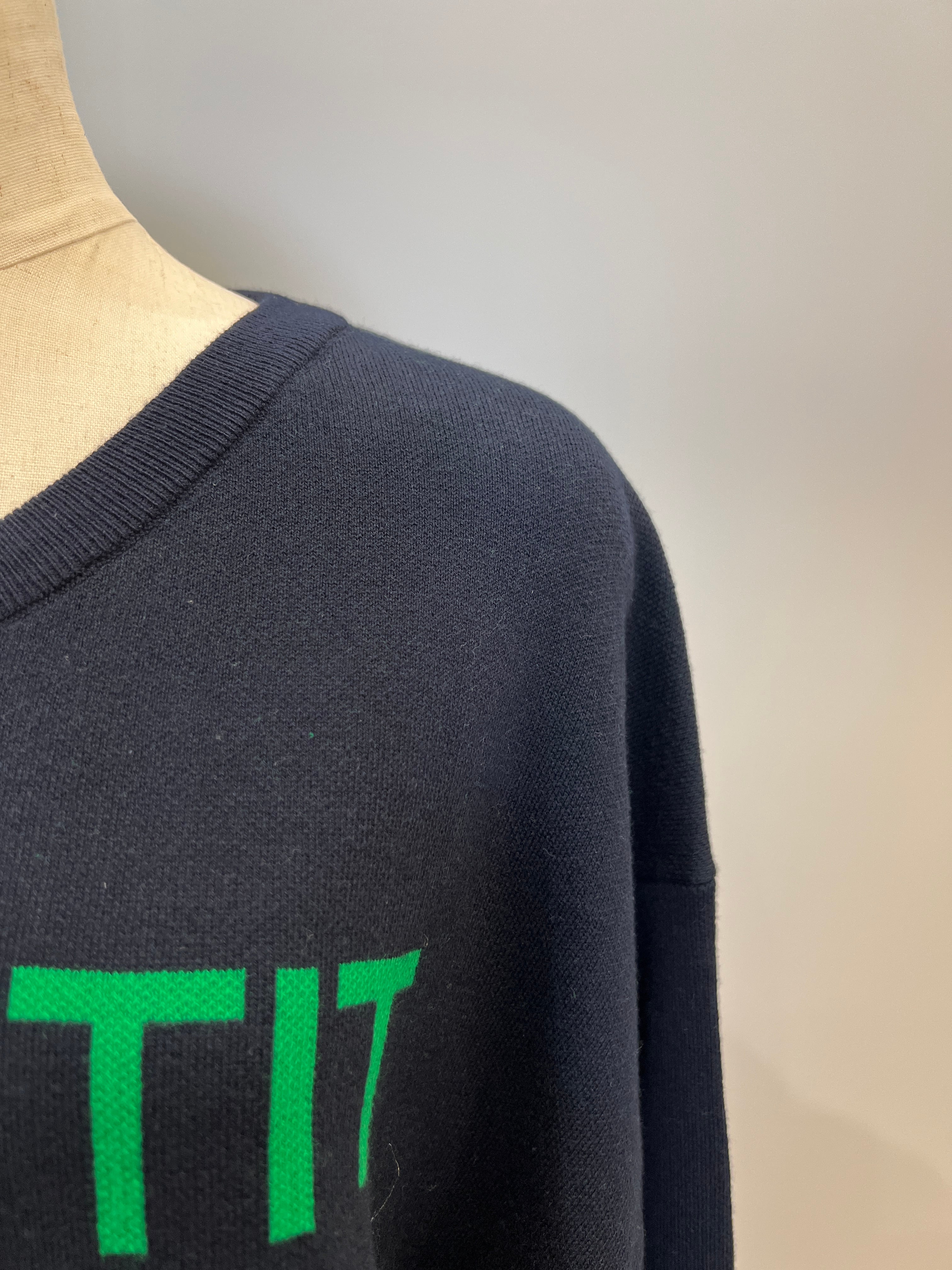配色のロゴがあっても、カジュアルすぎないところがポイントなスウェット見えするニットです。