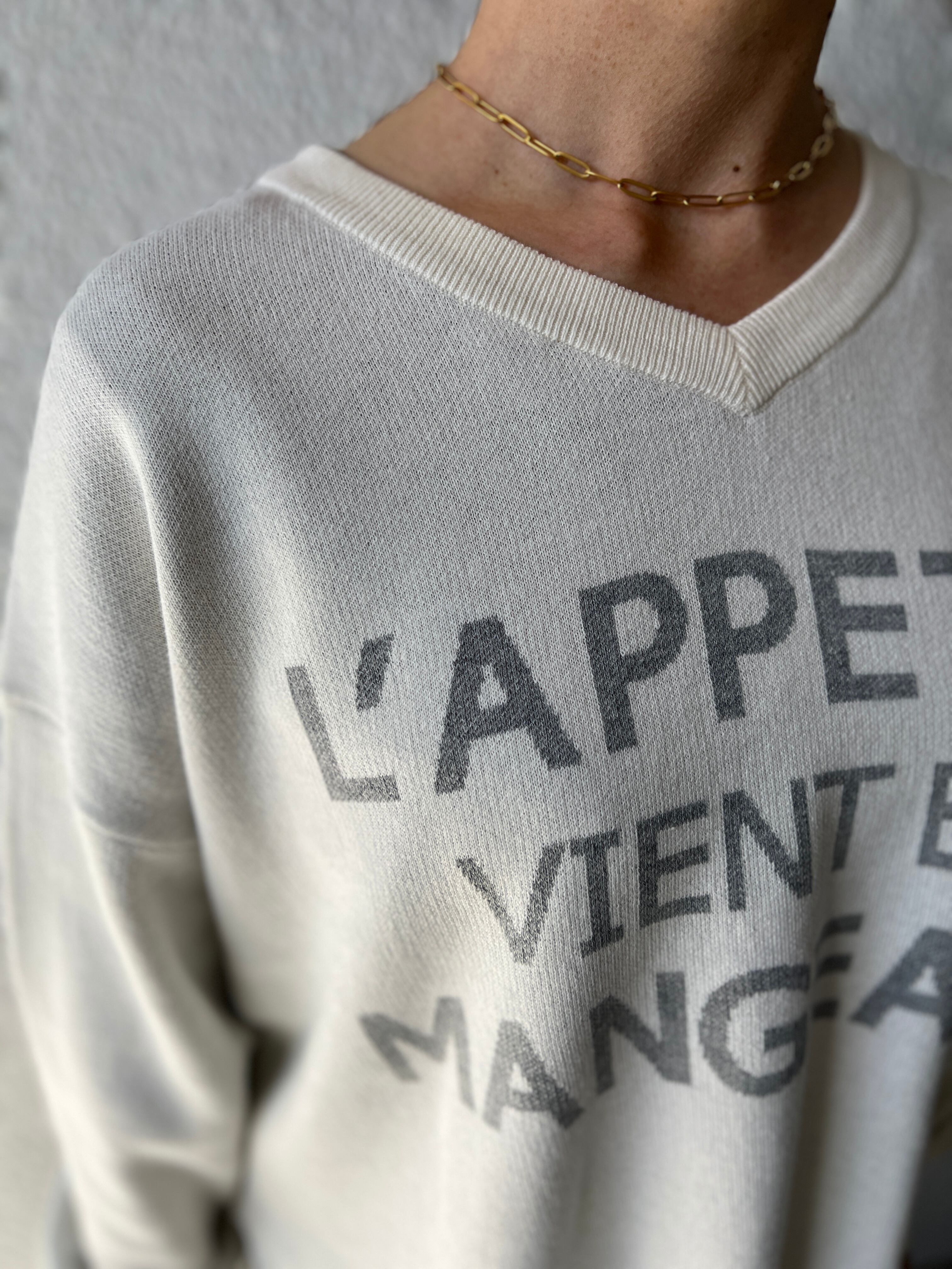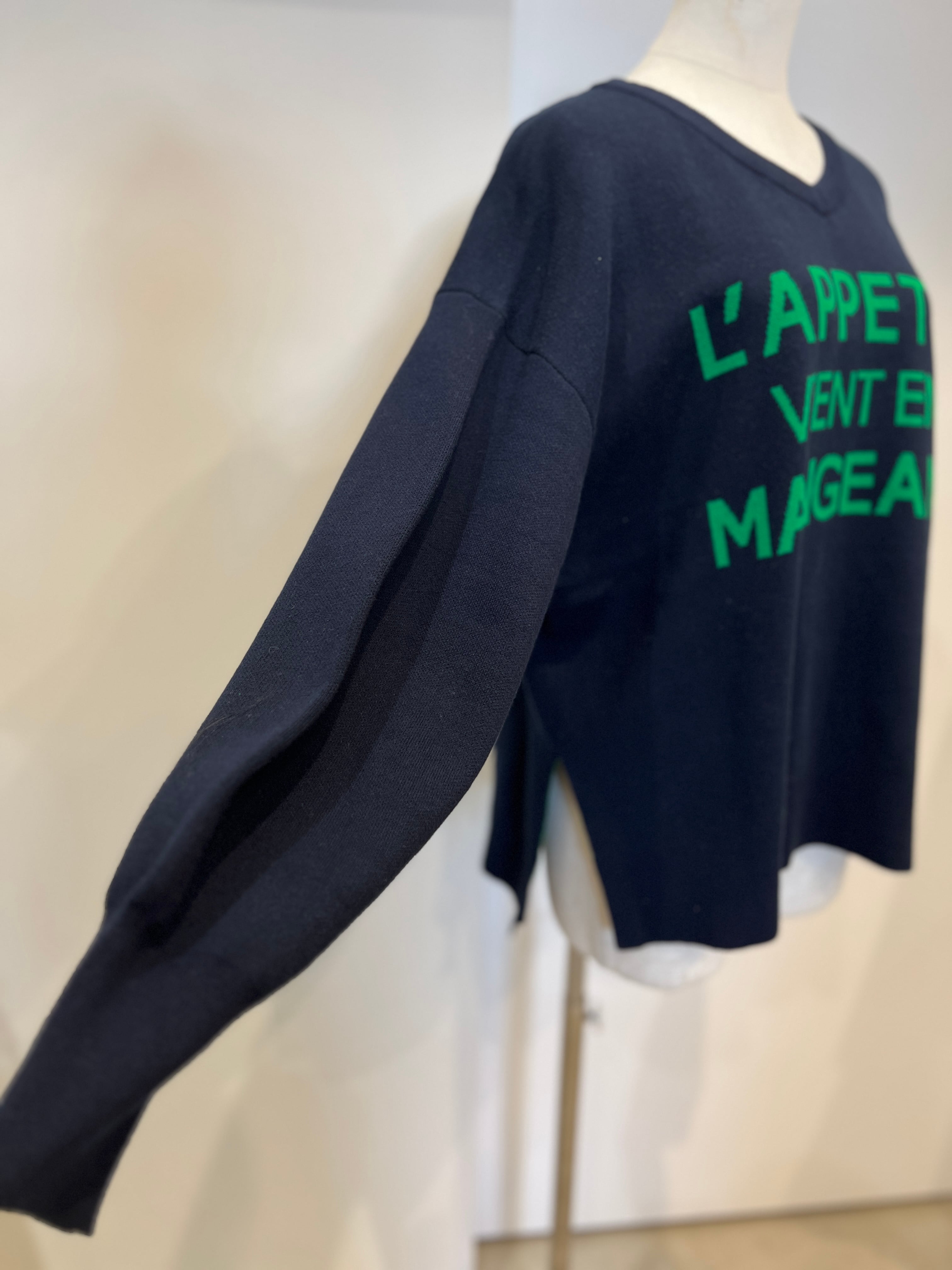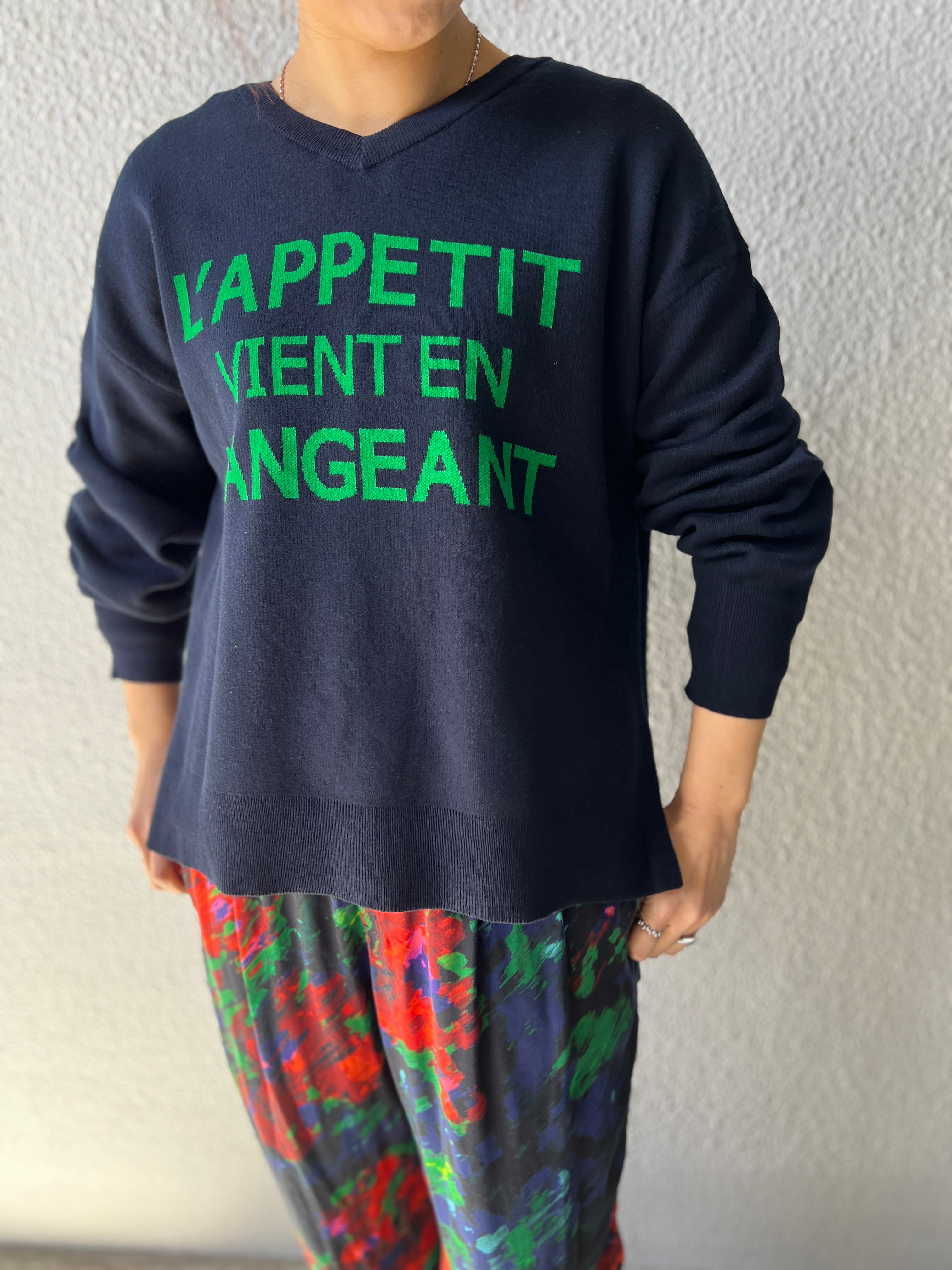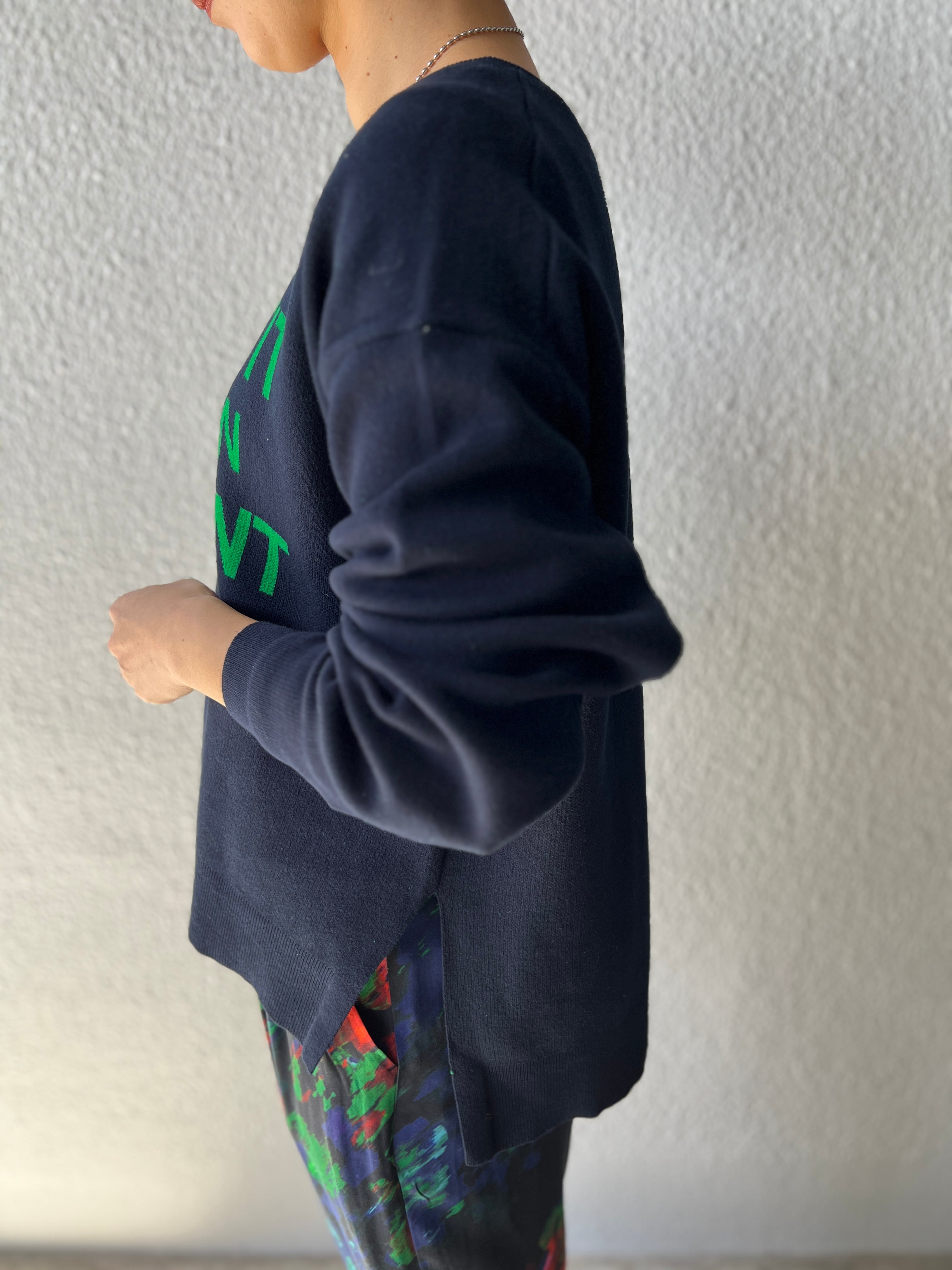 配色のロゴがあっても、カジュアルすぎないところがポイントなスウェット見えするニットです。