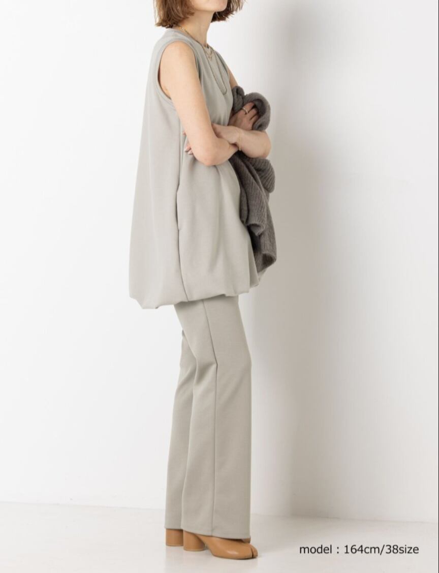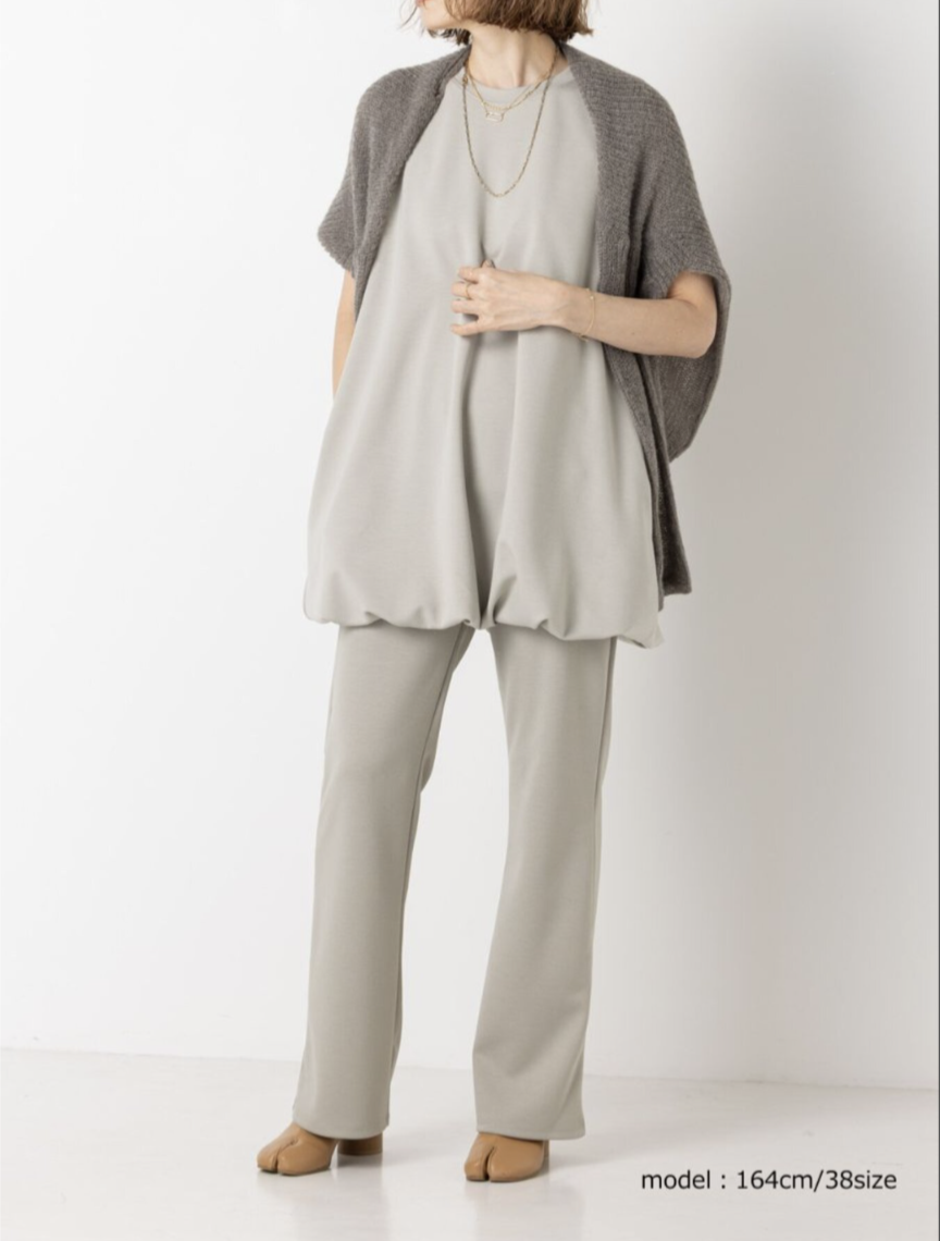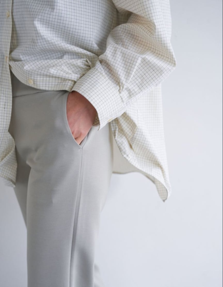 ほどよい厚みと弾力のあるダブルジャージー素材は体のラインを拾いすぎないのがポイント。イージーながらもきれいな印象を与えてくれる大人カジュアルにぴったりな素材です。ウエストのディテールはレギンスと同じ仕様でストレスフリーに、