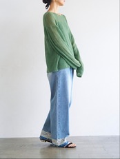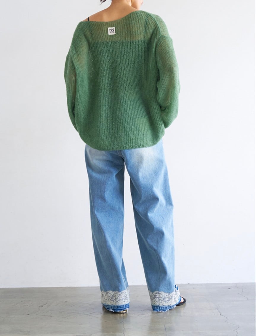 定番のタックワイドパンツと同じメンズライクな13.2オンスデニムを使用。無骨な印象のデニムにフェミニンなレースが相反するデザインで、レースを付けてから加工をすることでレースとデニムの風合いを馴染ませたビンテージ感がポイントです。裾は一度縫ったものを解いて作る断ち切りデザイン、後裾で深めにダーツをとって、ワイドシルエットのパンツを買って自分でリメイクしたようなストーリーを持たせました。後のベルトとポケットには金属チャームやニットパッチを付けてカスタマイズデニム風に仕上げています。