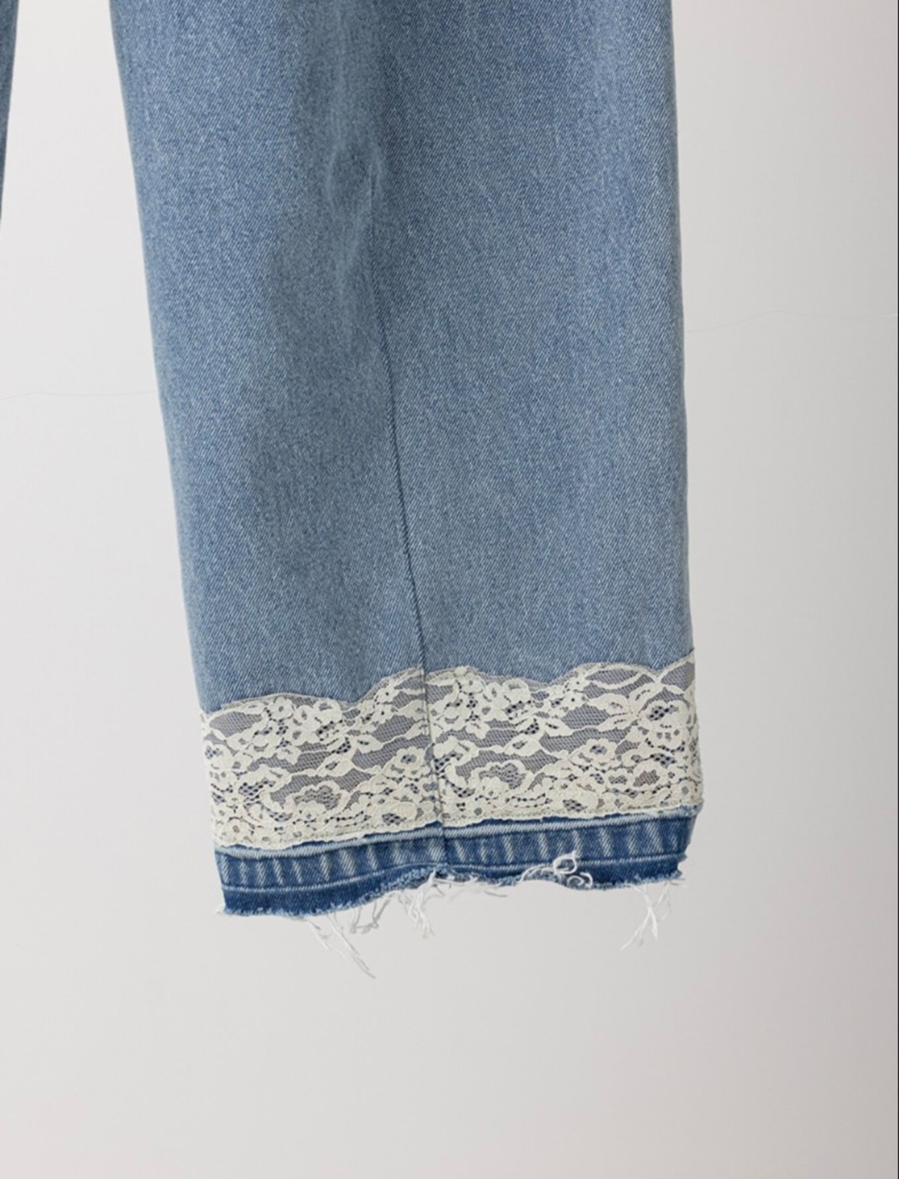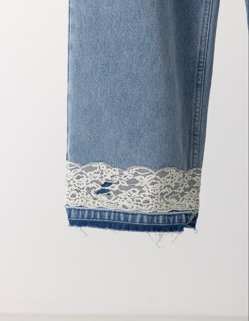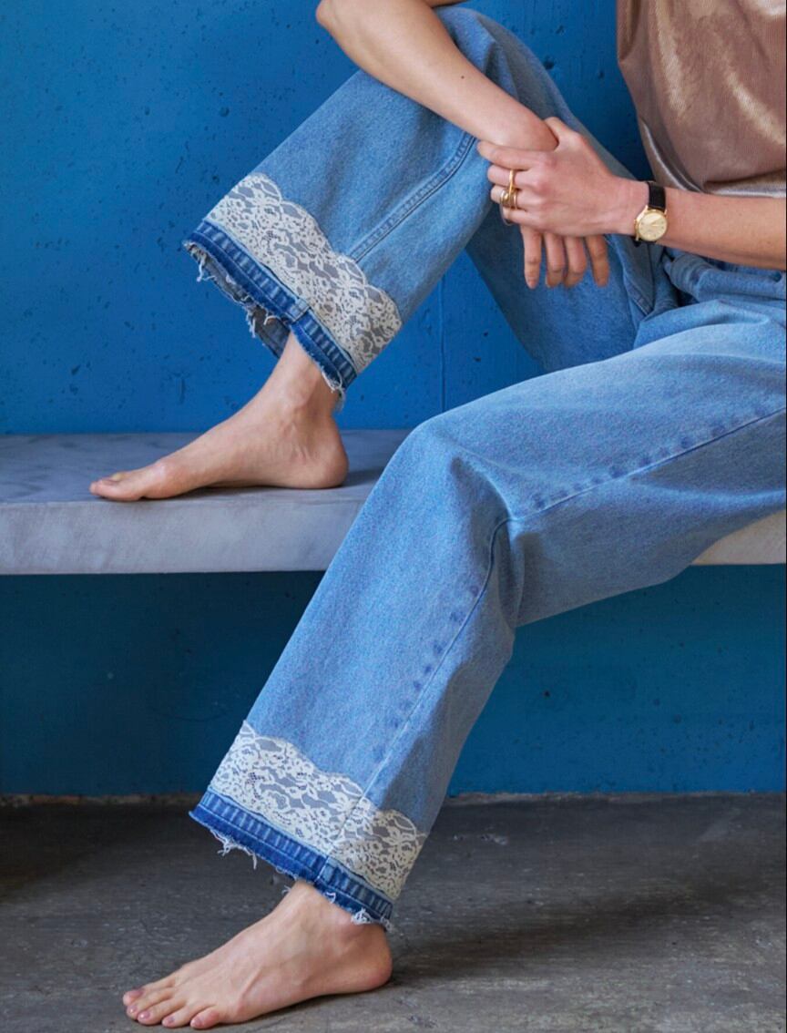 裾に繊細なレースを付けて加工したリメイク風のデニムパンツです。
