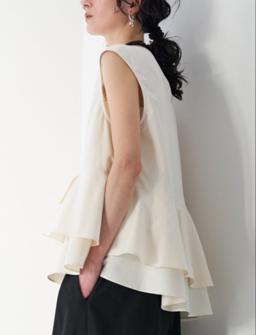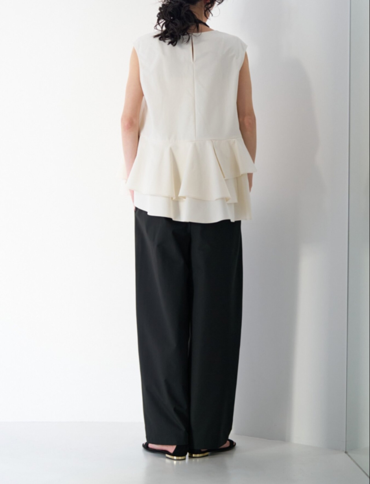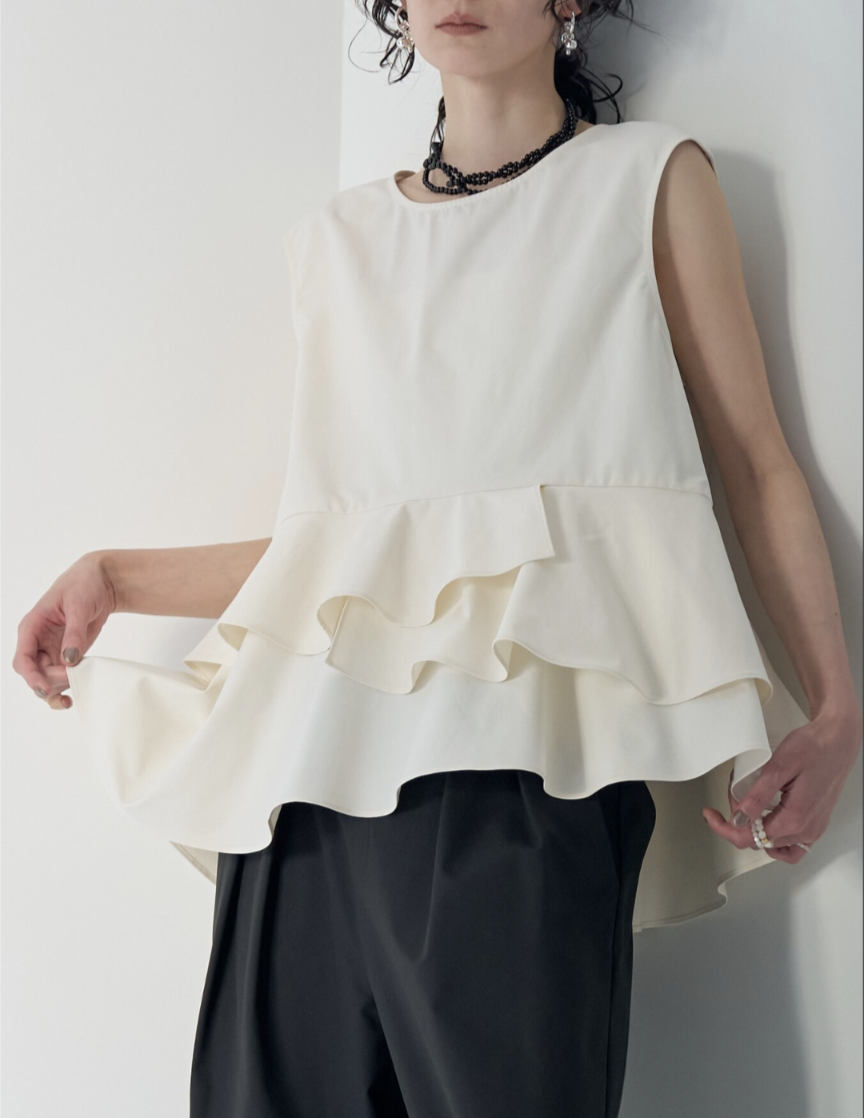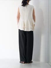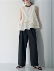 デザインは今の気分を取り入れたペプラムシルエット。ウエスト切り替えから広がるランダムなフレアが立体感を生み出し、甘くなりすぎずモードな印象に仕上げました。動くたびに揺れるヘムラインが、シンプルながらも着映えするポイントです。