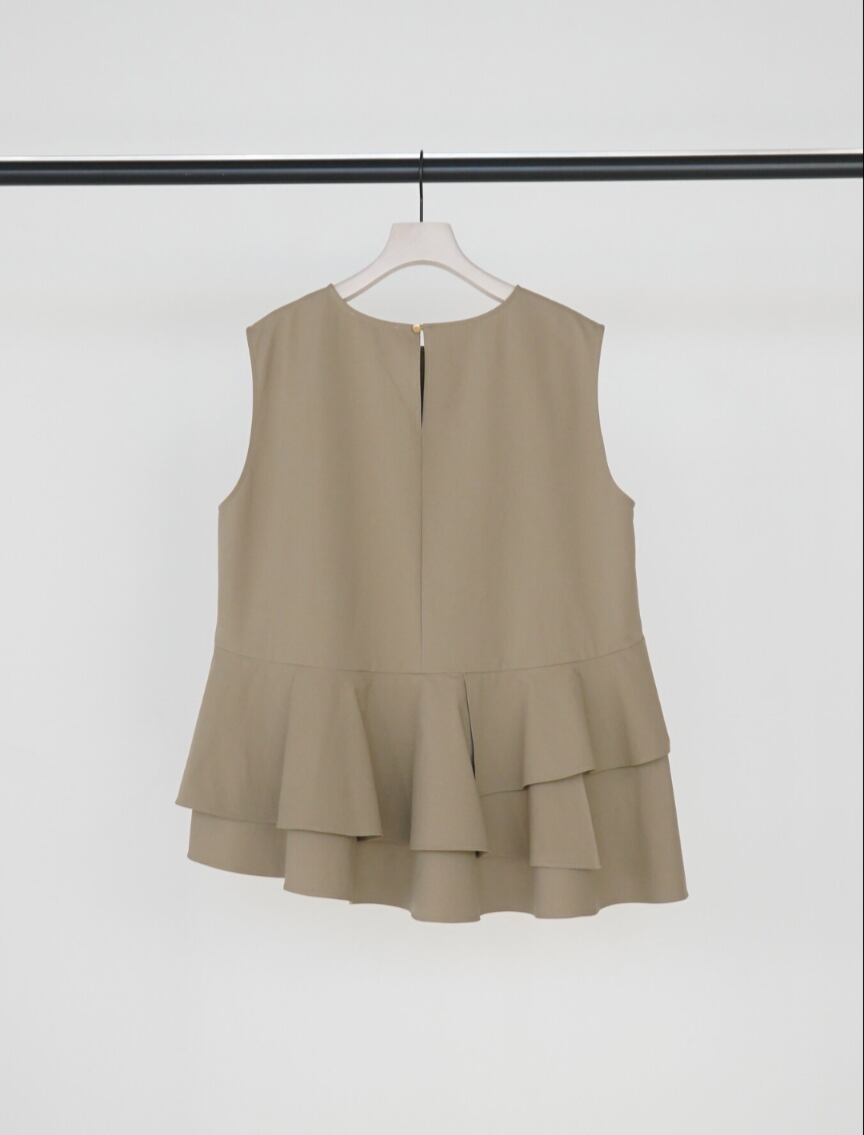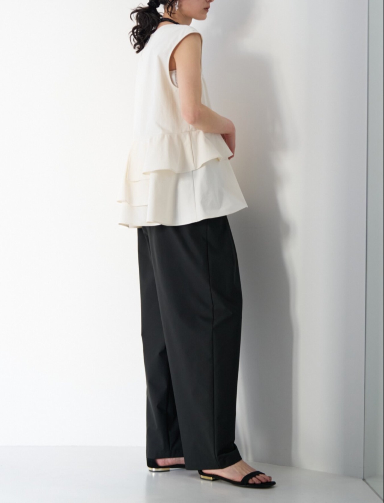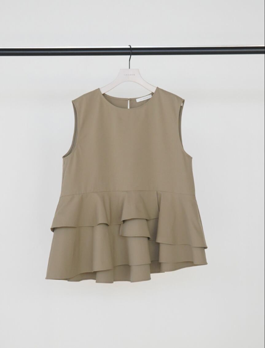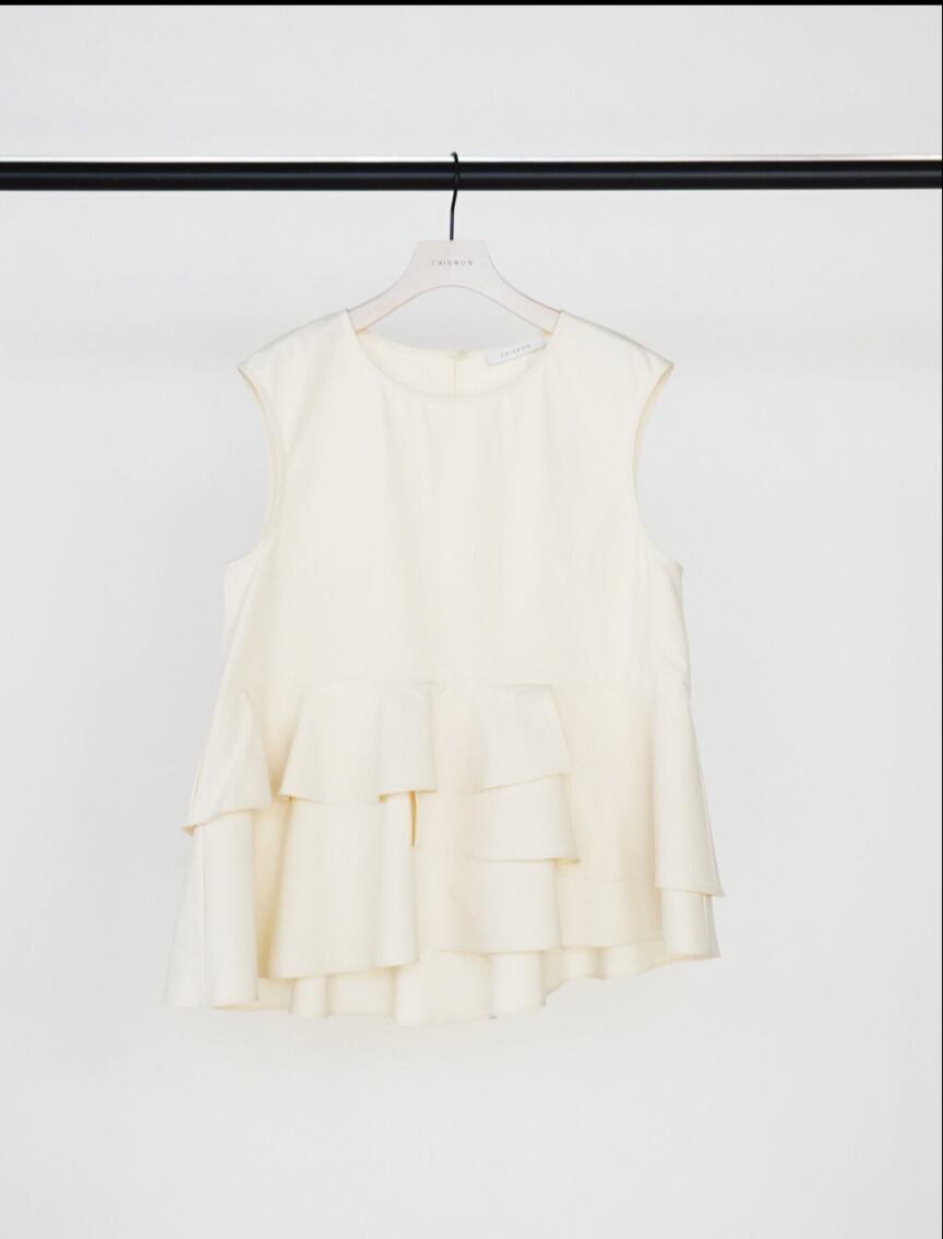 デザインは今の気分を取り入れたペプラムシルエット。ウエスト切り替えから広がるランダムなフレアが立体感を生み出し、甘くなりすぎずモードな印象に仕上げました。動くたびに揺れるヘムラインが、シンプルながらも着映えするポイントです。