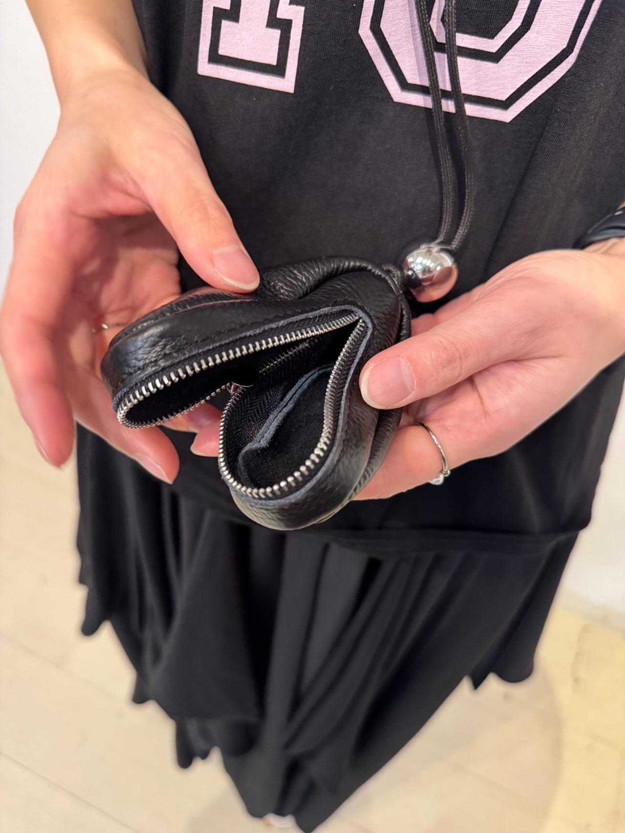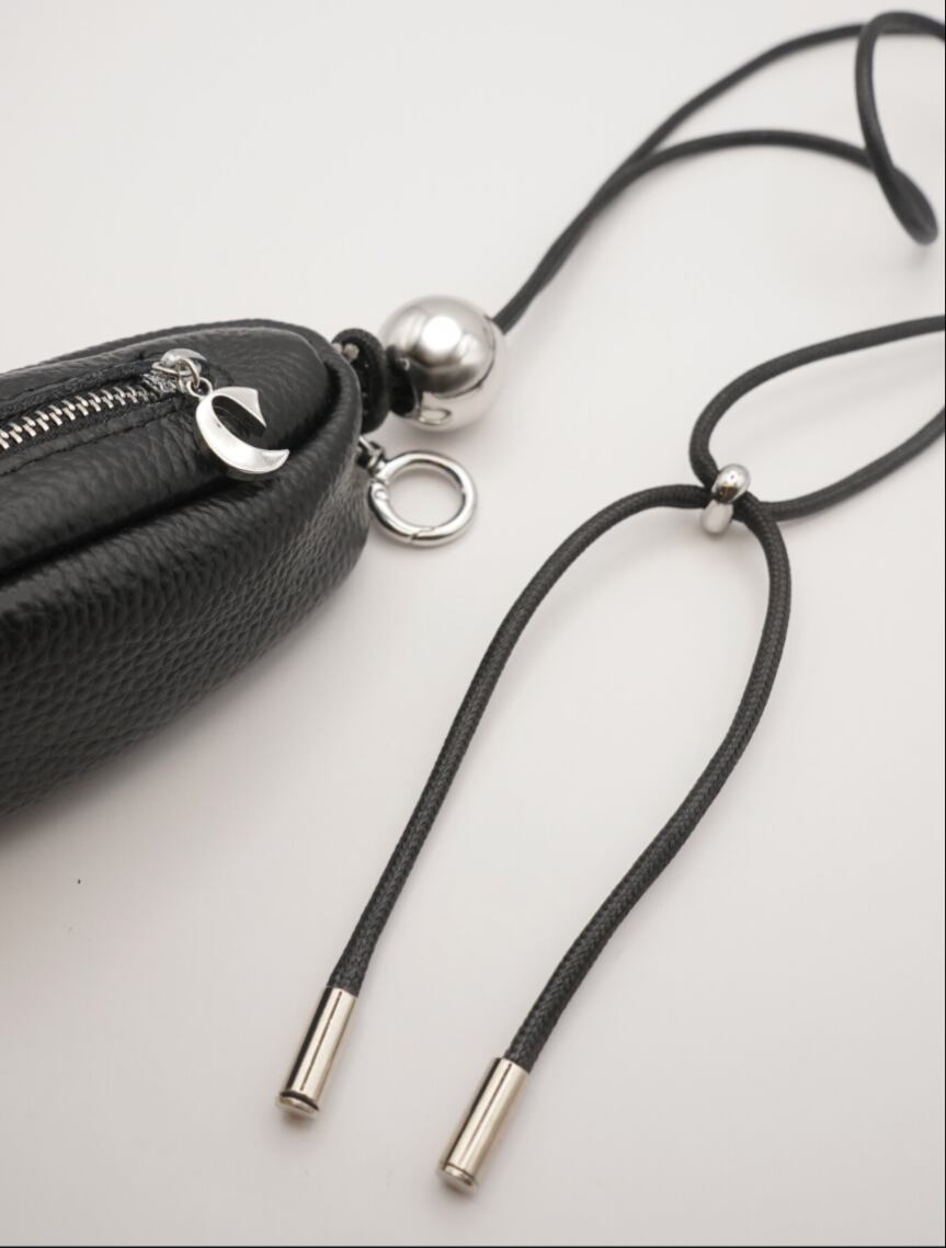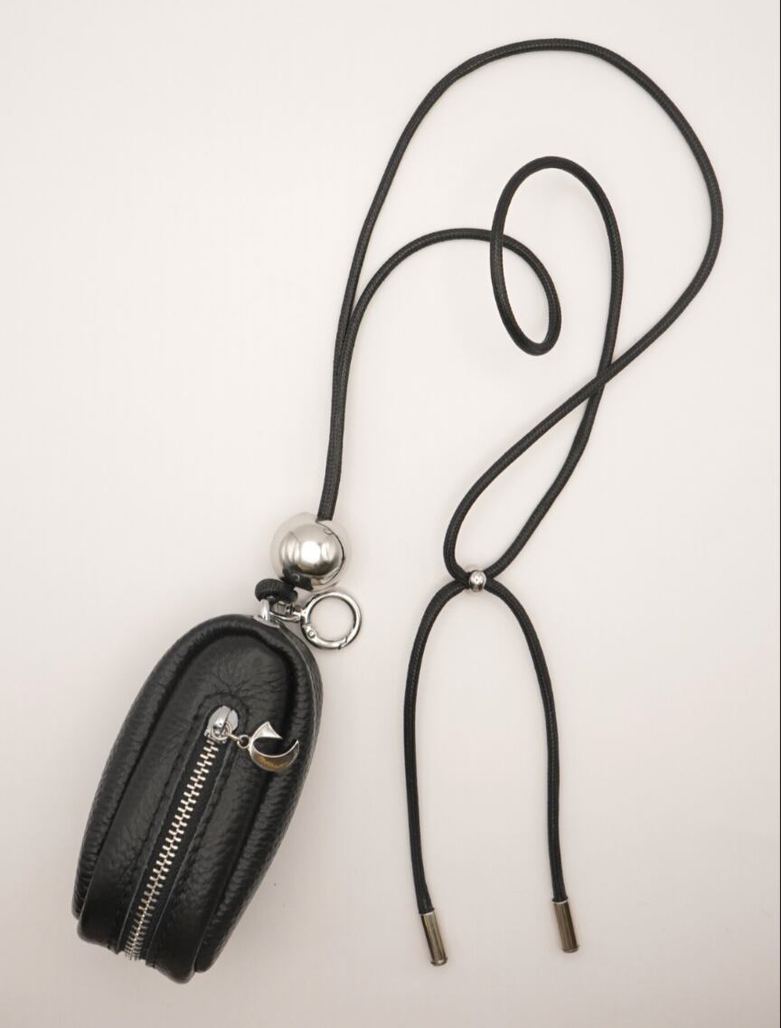 リアルレザー(牛革)のシンプルな縦長ポーチと、シルバーの丸玉付の黒コードの組み合わせが目を惹くポーチ&ネックレス。ポーチには丸カラビナが付いていますので、お手持ちのバッグやパンツのベルトループ部分につけて愉しんでも◎コードネックレス部分は長さ調節が可能なので、前に垂らしたり、ショルダー風にして斜めにつけてたり、短く持って小さいバッグのように使うのもオススメです。ポーチのチャック部分にはCHIGNONのCチャームを施しております。