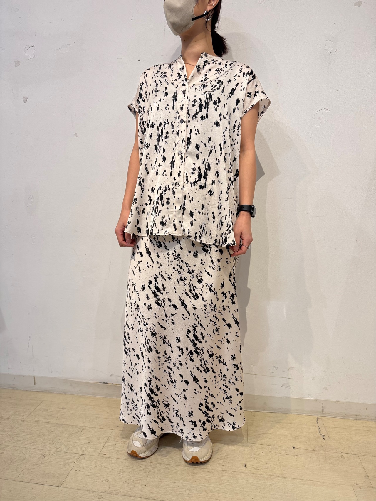 シンプルなトップスと合わせるだけで洗練された印象に。同素材のブラウスとセットアップでの着用もおすすめです。