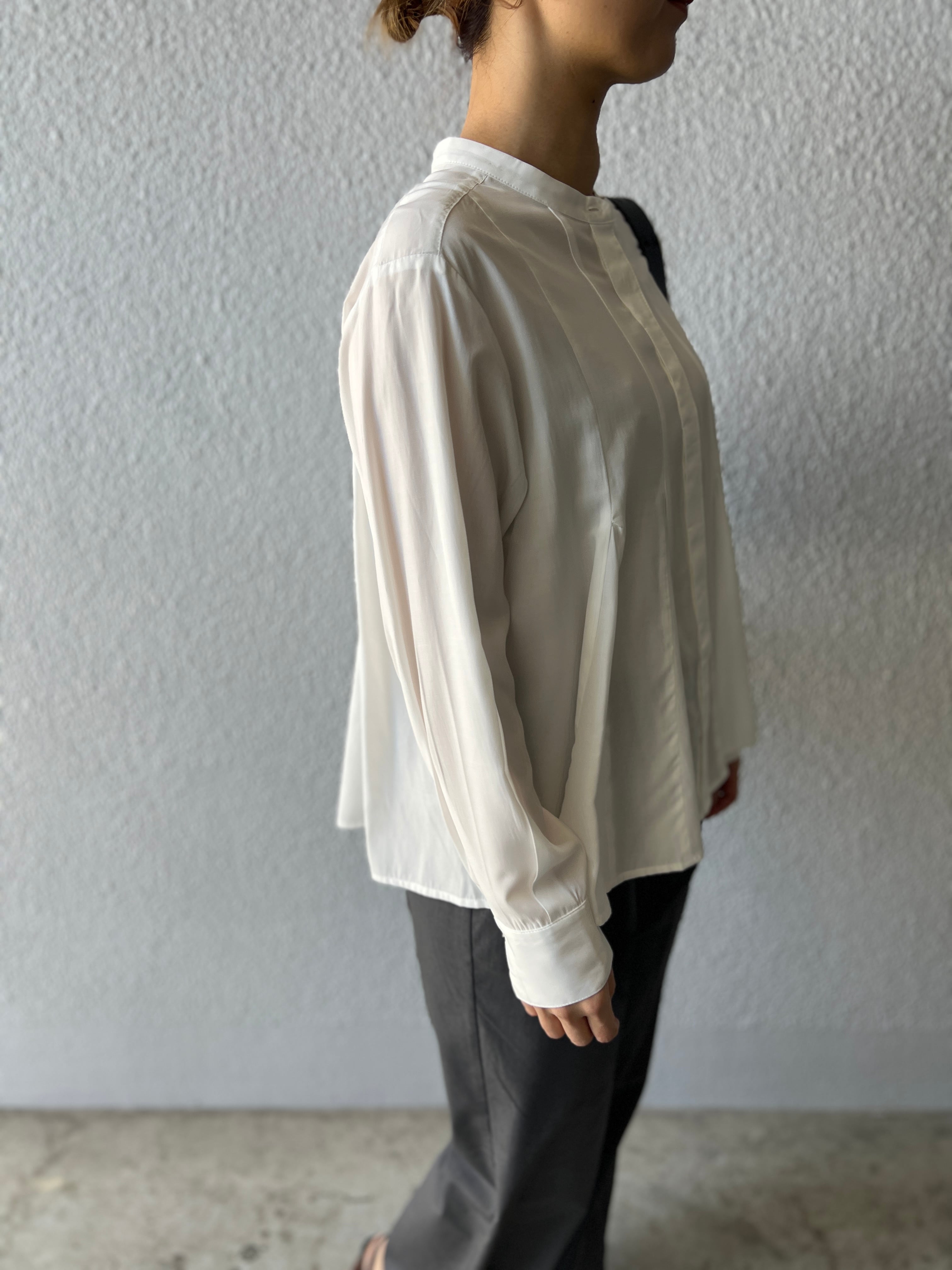 マチでフレア感を出し、腰回りもカバーしつつ、女性らしさの出るブラウスです。