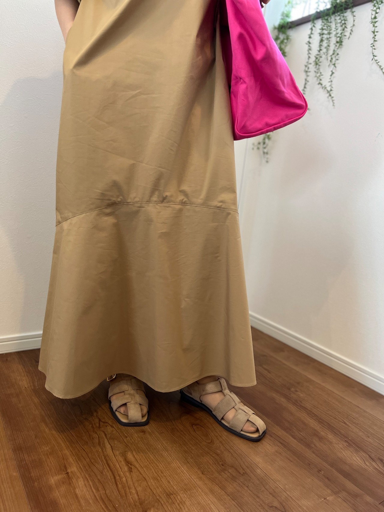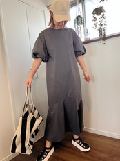 ボリュームスリーブと裾の切り替えが可愛いマキシ丈のワンピース