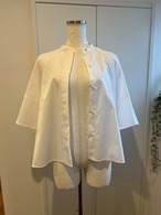 フレアスリーブが女性らしい五分袖シャツ。ノーカラーなので、シンプルながら大人っぽい印象を与えるデザインです。素材は、綿とポリエステルの混合でシワになりにくく、体に余裕のあるシルエットで着心地も抜群です。