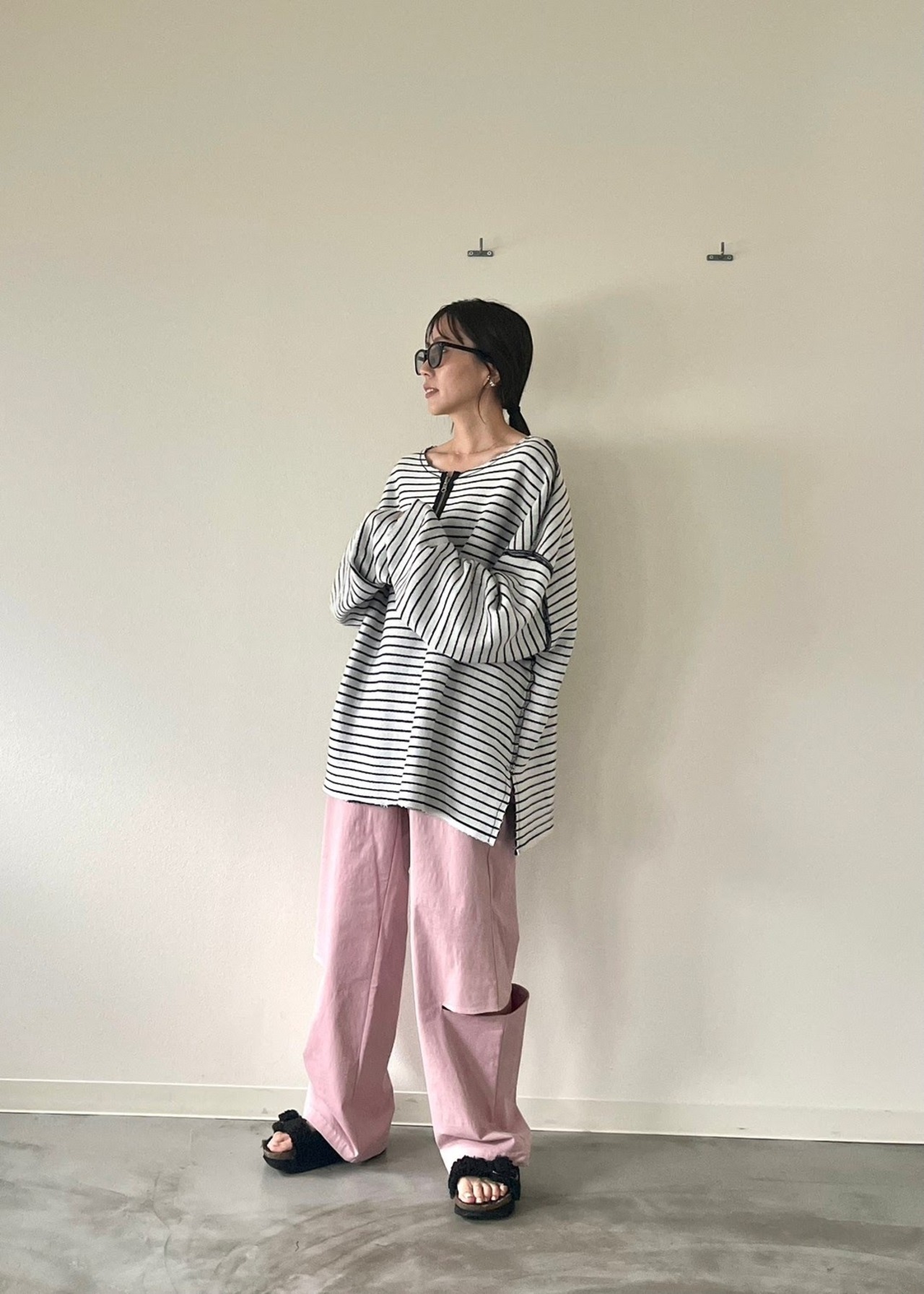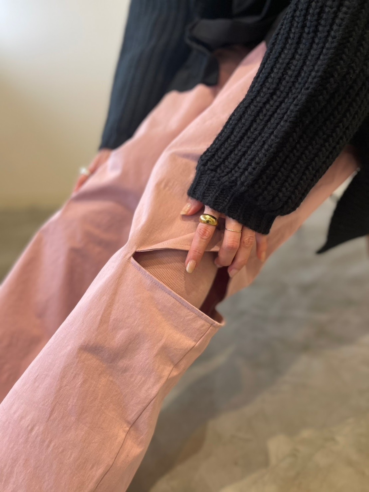 膝下カットアウトデザインで適度な肌見せが女性らしさを演出するパンツ。