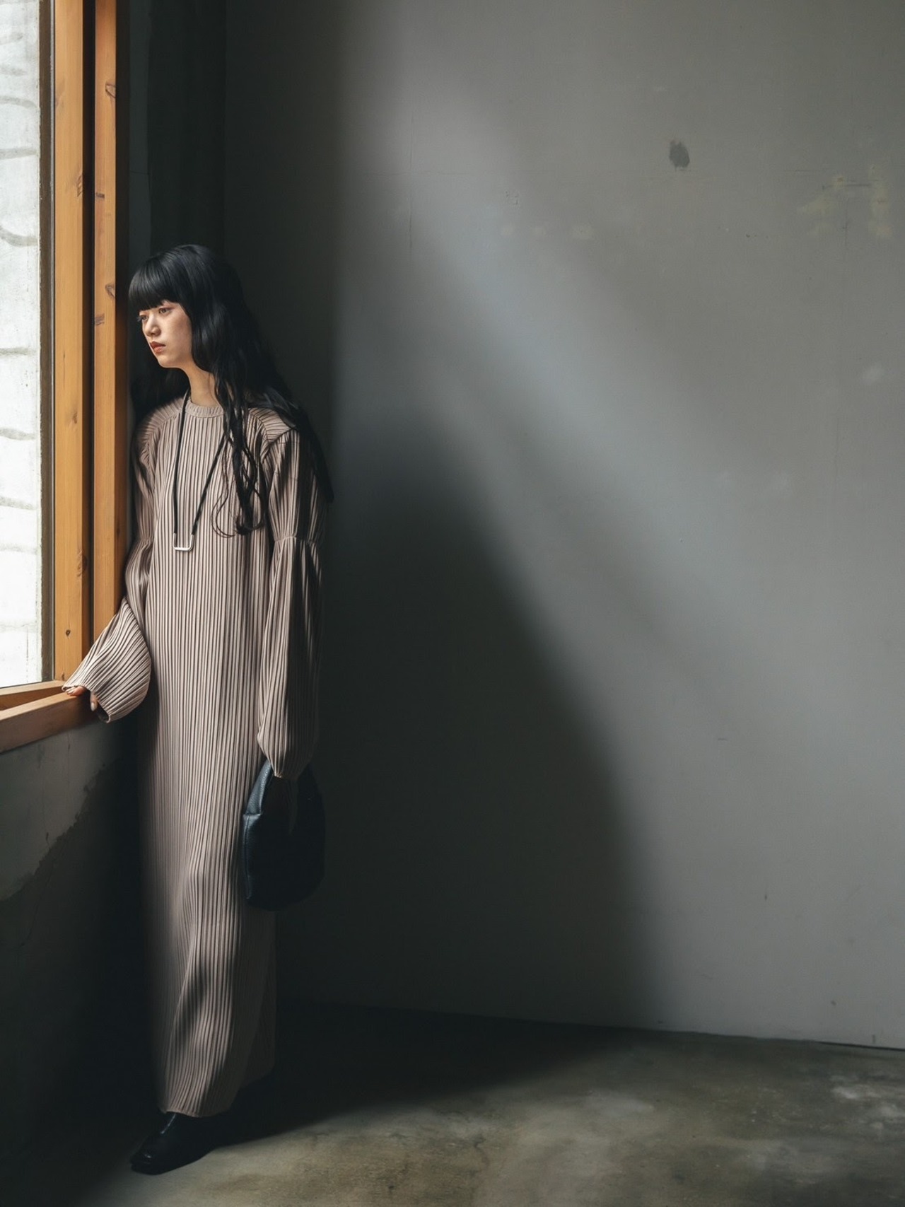 長さと太さのある丸紐は冬の分厚いニットにも負けず、