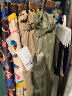 ウエストは総ゴムで共布のベルト付。フロントにベンツあき。ゴム上のタックフリルデザインで、「腰位置が高く見えスタイルアップ効果あり。