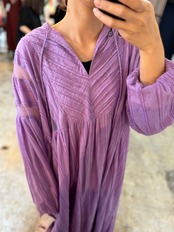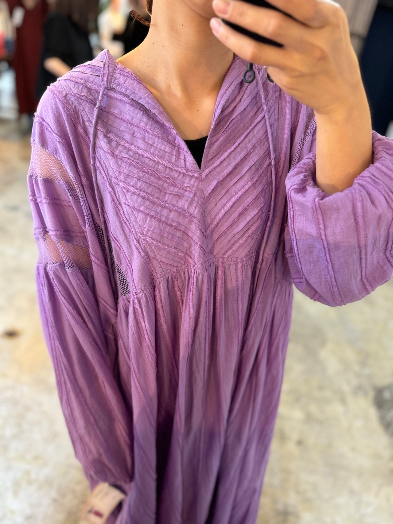 す。衿ひも先鈴型チャーム付き。ギャザーたっぷりで涼しげな春夏らしい印象です。パンツとのレイヤードがオススメ。