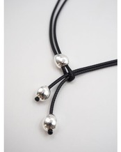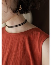 少しいびつなニュアンス感あるメタルパーツとしなやかなコードの組み合わせのチョーカーネックレス。存在感ある大人チョーカーはいつものコーデにアクセントを加えてくれます。シルバー×ブラックの定番カラーの他に、今回はゴールド×ブラウンの少し柔らかで女性らしい品のあるカラーもご用意しております。着用方法は、コードの「わ」に先端2本を通し、一番大きなメタルパーツを「わ」に寄せて軽く固定させます。